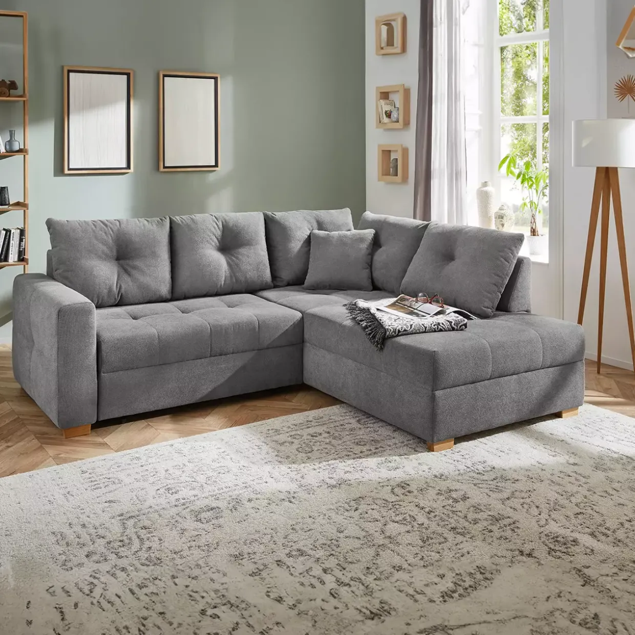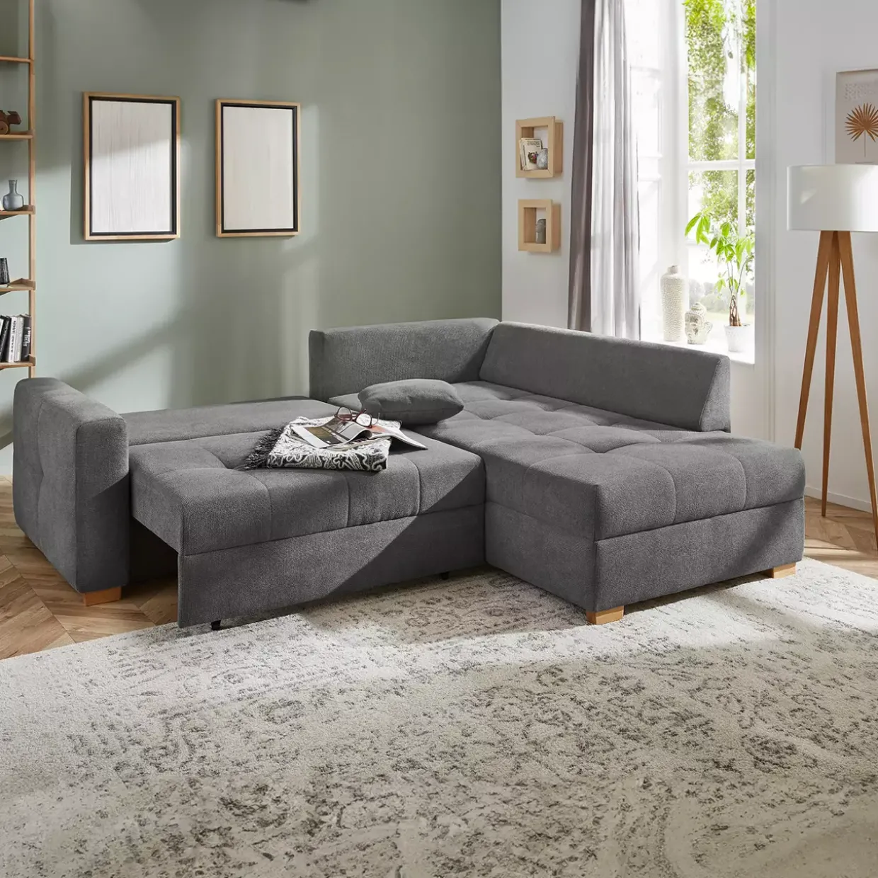 Mit dem inkludierten Bettkasten bietet die Garnitur praktischen Stauraum für Kissen und Decken, was sowohl Ordnung als auch Komfort gewährleistet. Der hochwertige Stoffbezug sorgt nicht nur für ein angenehmes Sitzgefühl, sondern ist auch pflegeleicht und langlebig. Die Rückenlehne ist vollständig bezogen, was die Polstergarnitur von allen Seiten ansprechend wirken lässt und flexible Raumgestaltungen ermöglicht.