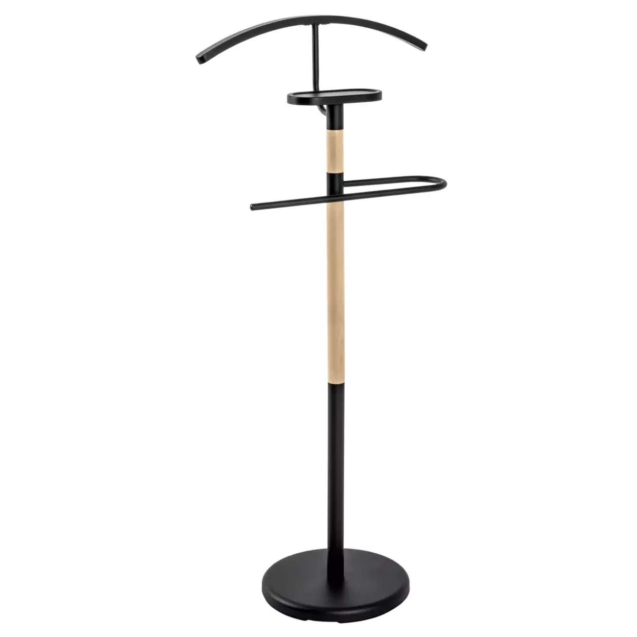 Ein stilvolles Design prägt den modernen Herrendiener Josef. Die Kombination aus massivem Buchenholz und schwarzem Stahl verleiht ihm ein ansprechendes Erscheinungsbild, das sich harmonisch in verschiedene Raumkonzepte einfügt. Die klare, zeitgemäße Formgebung wird durch die elegante Fußplatte unterstrichen, die dem Herrendiener Stabilität und eine markante Präsenz verleiht.