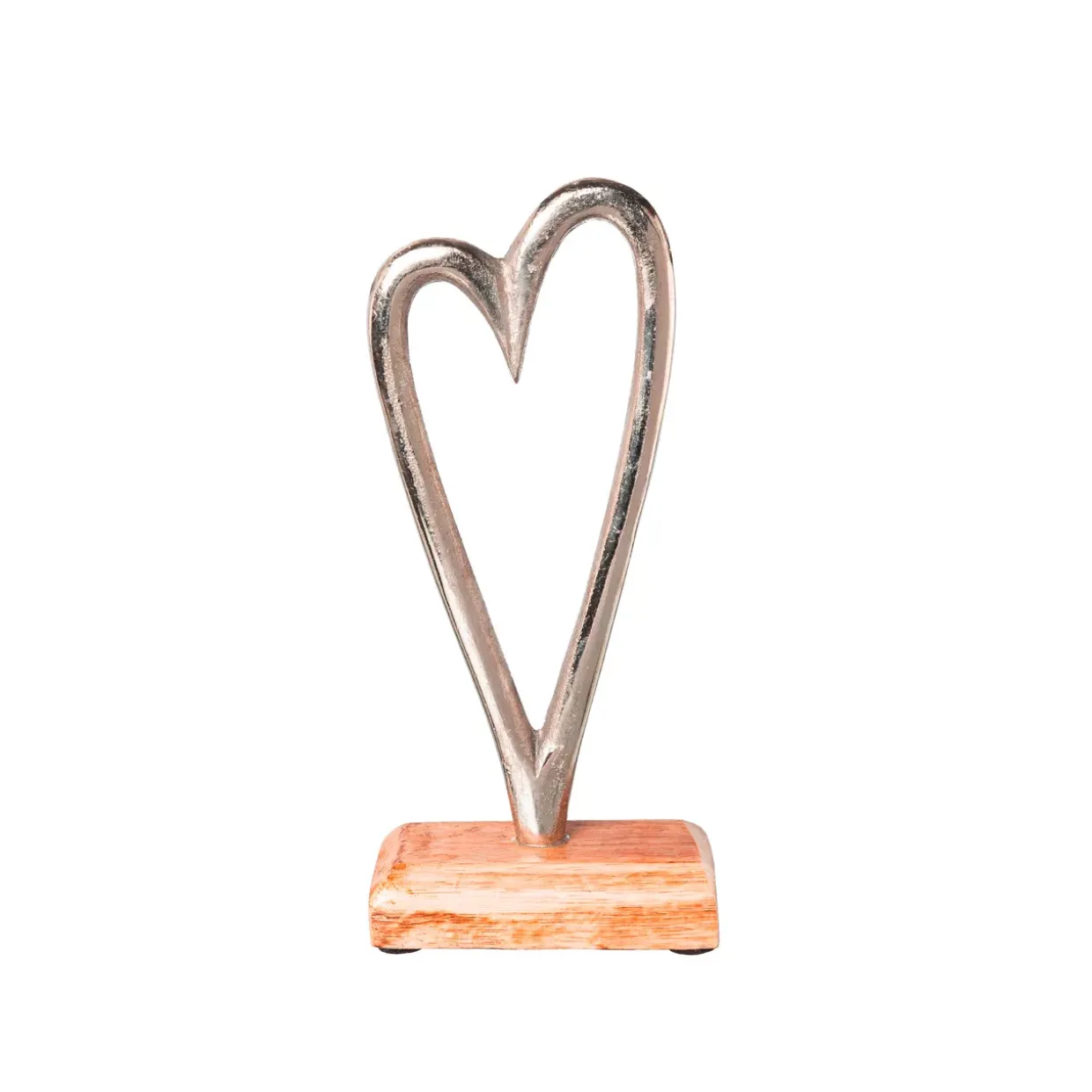 Ein silberfarbener Glanz verleiht dem Herz eine anmutige Note und reflektiert das Licht auf faszinierende Weise. Die harmonische Verbindung von kühlem Metall und warmer Holzbase schafft einen ansprechenden Kontrast, der sich in verschiedene Einrichtungsstile problemlos einfügt.