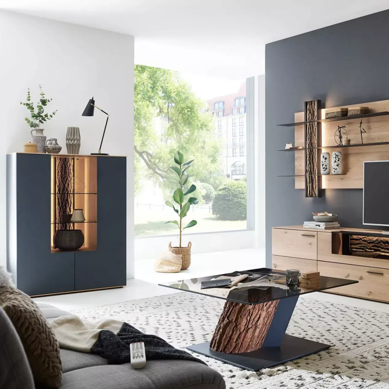 Eine Besonderheit des Runa Highboards ist die Verwendung von echter Baumrinde, die vom ganzen Stamm abgesägt wird. Dies ermöglicht es, einen kompletten Teil des Baumes in das Design zu integrieren, was dem Möbelstück eine unverwechselbare, natürliche Note verleiht. Die Kombination aus massiv gebürsteter Kerneiche mit anthrazitfarbenen Applikationen schafft ein harmonisches Zusammenspiel zwischen Natur und Moderne.