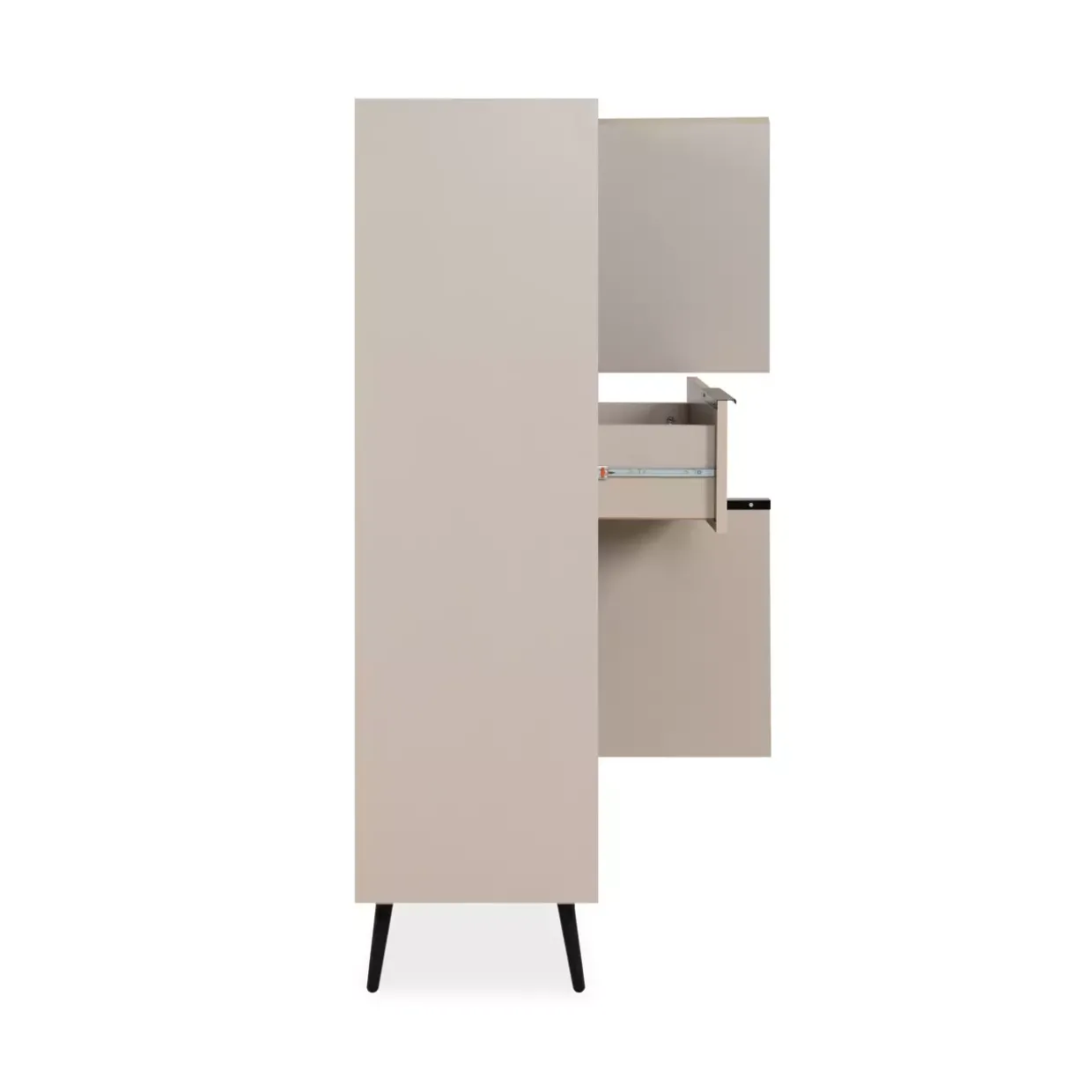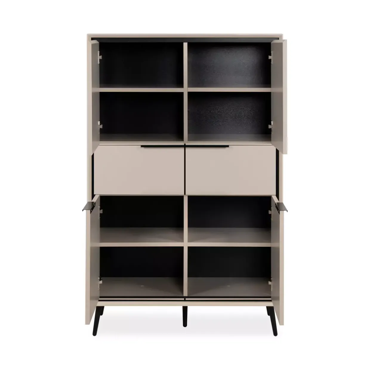 Griffloses Design mit Schrägkante eröffnet eine Welt der modernen Eleganz und Funktionalität. Dieses Highboard fügt sich nahtlos in Ihre Einrichtung ein und bietet eine stilvolle Lösung für jeden Raum. Die Kombination aus Sand und Schwarz verleiht ihm eine zeitlose Ästhetik, die sowohl in minimalistische als auch in opulente Wohnstile passt.