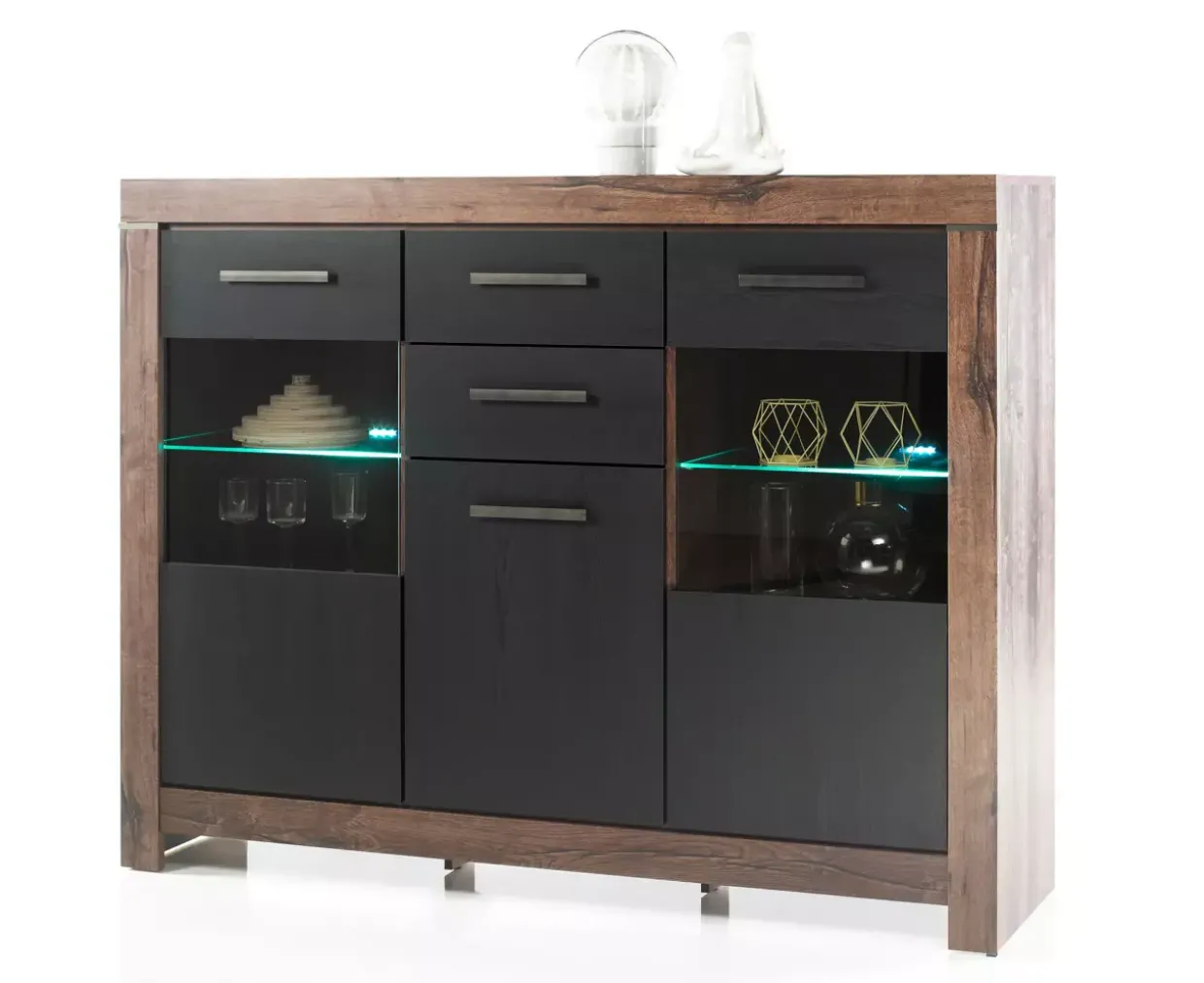 Eleganz trifft auf Funktionalität im Balin Highboard. Die Verbindung aus Glas, Holzwerkstoff und Metall verleiht dem Möbelstück eine moderne Ausstrahlung, die in jedem Raum Akzente setzt. Die Farbvarianten Braun und Schwarze Eiche sorgen dafür, dass das Highboard sich harmonisch in verschiedene Einrichtungsstile einfügt.Ein besonderes Highlight stellt die integrierte LED-Beleuchtung dar, die nicht nur für eine angenehme Atmosphäre sorgt, sondern auch Ihre dekorativen Objekte ins rechte Licht rückt. Dieses Feature macht das Highboard nicht nur zu einem funktionalen, sondern auch zu einem dekorativen Element Ihrer Wohnlandschaft.Die durchdachte Materialkombination verspricht Stabilität und Langlebigkeit. Glasflächen bieten eine klare Sicht auf Ihre Lieblingsstücke, während die robusten Holzelemente für eine stabile Struktur sorgen. Metallene Details runden das zeitgemäße Design ab und verleihen dem Möbelstück eine besondere Note.Für alle, die Wert auf Design und Qualität legen, bietet das Balin Highboard eine ideale Lösung. Es eignet sich perfekt zur Aufbewahrung und Präsentation von Büchern, Geschirr oder dekorativen Accessoires. Durch die Möglichkeit, verschiedene Farbvarianten zu wählen, lässt es sich individuell an Ihre Einrichtung anpassen. Ein Möbelstück, das sowohl durch sein Aussehen als auch durch seine Funktionalität überzeugt.
