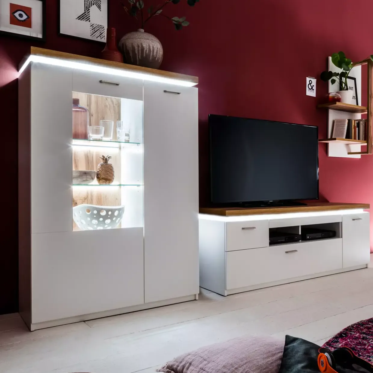 Das Highboard besticht durch seine integrierte Beleuchtung der Deckplatte, die nicht nur für eine stimmungsvolle Atmosphäre sorgt, sondern auch bestimmte Dekorationsobjekte gekonnt in Szene setzt. Die moderne Farbgebung, eine harmonische Mischung aus Weiß und Wotan Eiche, fügt sich nahtlos in verschiedene Einrichtungsstile ein.