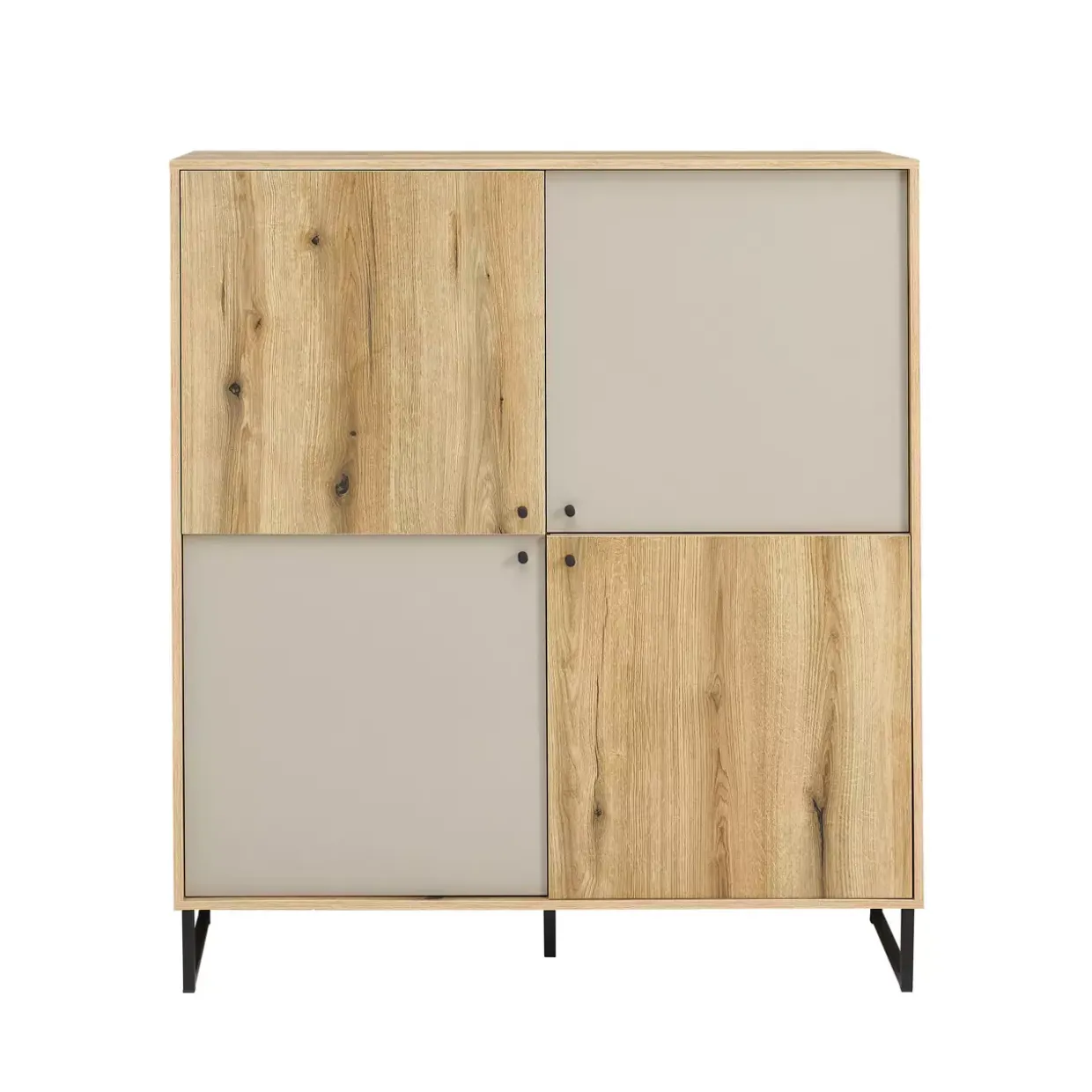 Mit seinen klaren Linien und dem minimalistischen Design fügt sich das Highboard nahtlos in moderne Wohnkonzepte ein. Der sanfte Ton von Sandgrau ergänzt die natürliche Holzoptik und schafft ein harmonisches Gesamtbild. Diese Farbgebung ermöglicht es, das Möbelstück in verschiedene Einrichtungsstile zu integrieren, ohne aufdringlich zu wirken.