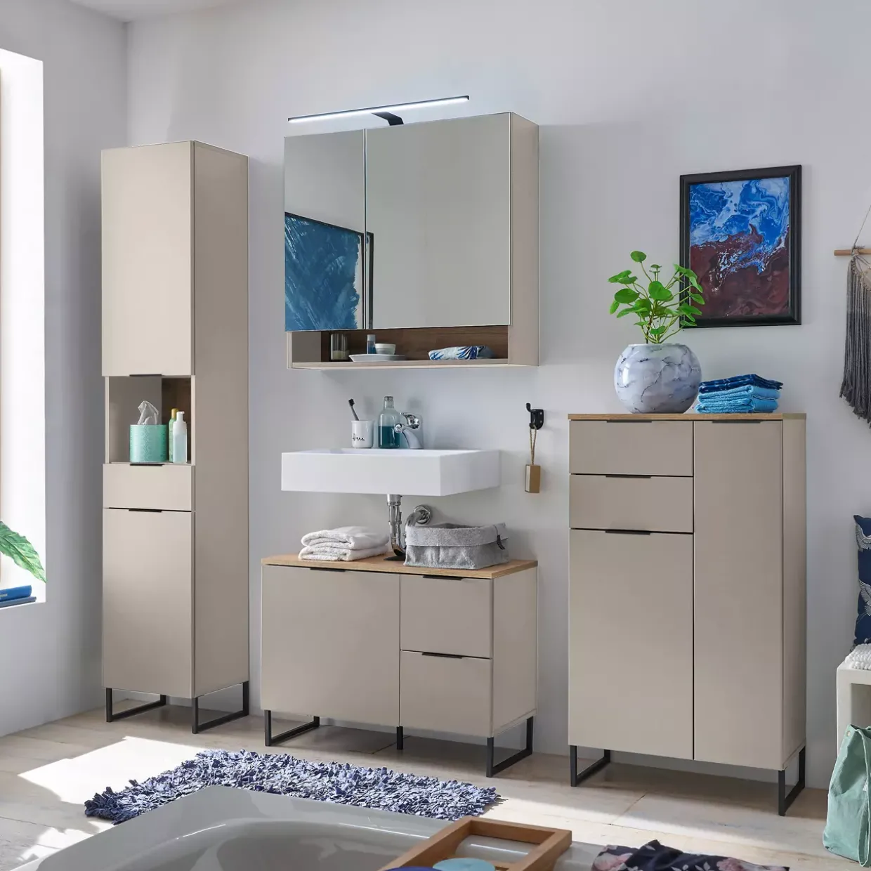 Ein Badschrank, der mit seiner modernen Gestaltung in kaschmirfarbenem MDF besticht, bringt zeitlose Eleganz in Ihr Badezimmer. Die warme Nuance der Deckplatte in Evoke Eiche ergänzt das Design harmonisch und sorgt für ein stilvolles Ambiente. Qualität und Robustheit sind durch die Verwendung von hochwertigem Holzwerkstoff garantiert.