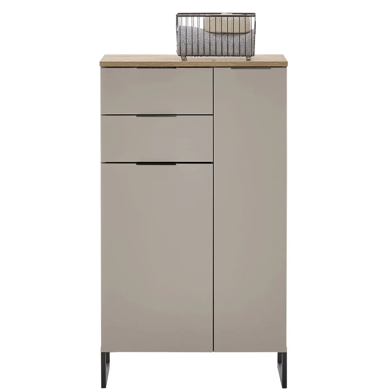 Metallene Elemente in Schwarz setzen subtile Akzente und unterstreichen das moderne Design dieses Schranks. Der durchdachte Materialmix sorgt nicht nur für eine ansprechende Optik, sondern auch für Langlebigkeit und Stabilität. Beachten Sie, dass Dekoration nicht im Lieferumfang enthalten ist, sodass Sie den Schrank nach Ihren Vorstellungen gestalten können.