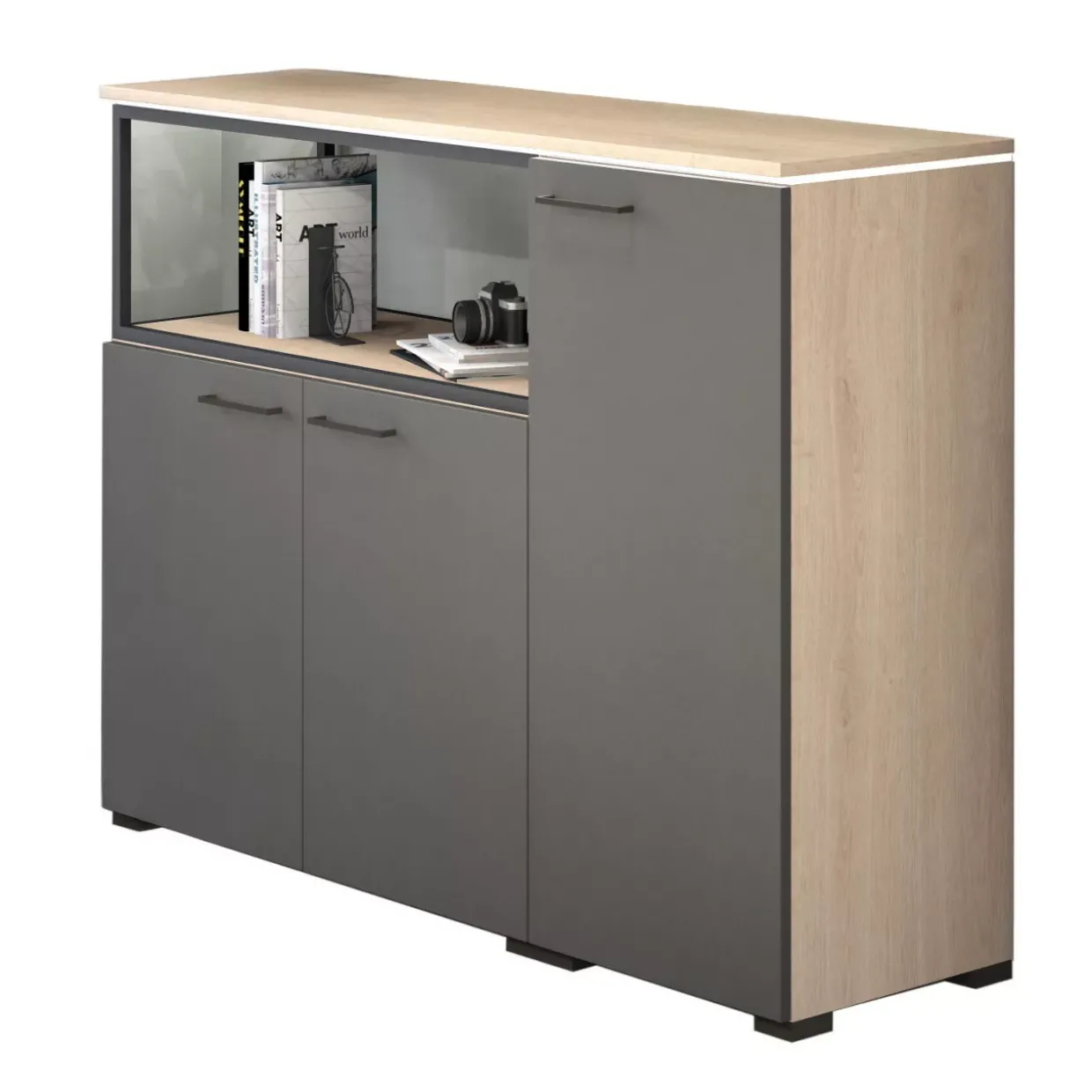 Ein Material, das Beständigkeit verspricht: Der Holzwerkstoff sorgt für Stabilität und Langlebigkeit. Die robuste Konstruktion gewährleistet, dass das Highboard nicht nur stilvoll, sondern auch funktional ist. Anthrazitfarbene Akzente runden das Gesamtbild ab und setzen moderne Akzente in Ihrem Wohnbereich.