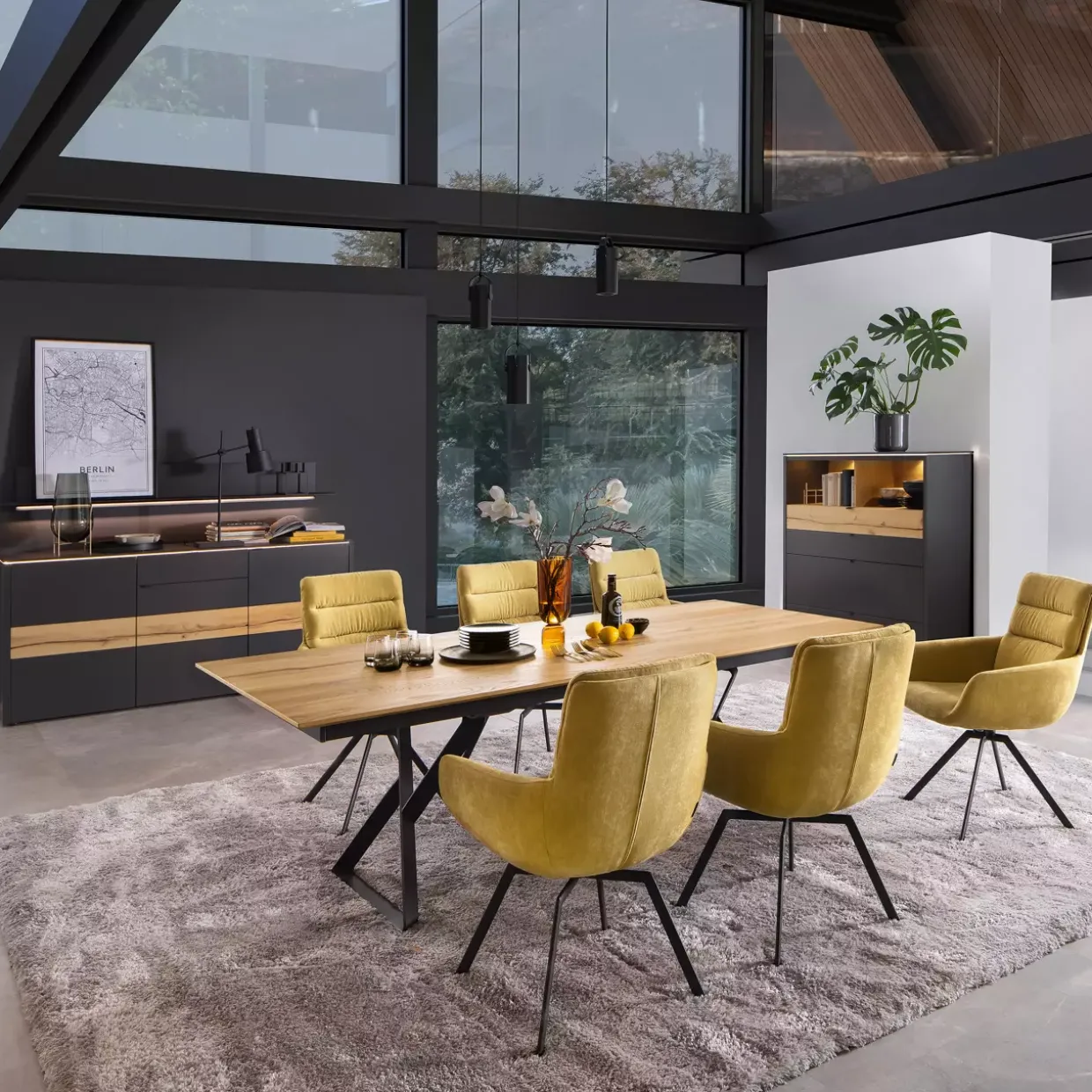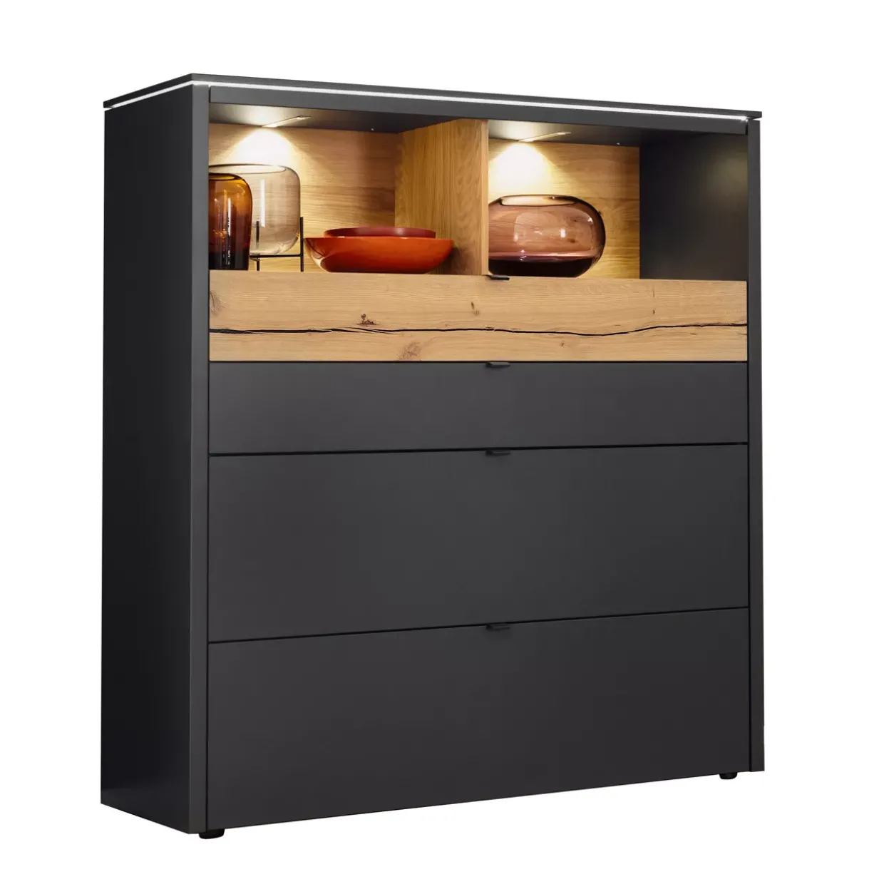 Hochwertige Beschläge mit Selbsteinzug und Dämpfung stehen im Mittelpunkt des modernen Highboards, das durch seine Kombination aus Holz und Metall besticht. Die gelungene Fusion dieser Materialien verleiht dem Möbelstück nicht nur Stabilität, sondern auch eine edle Optik. Die Farbe anthrazit matt ergänzt sich perfekt mit der Akzentfront in Balkeneiche, wodurch ein harmonisches Gesamtbild entsteht, das sowohl in klassische als auch in moderne Wohnräume passt.