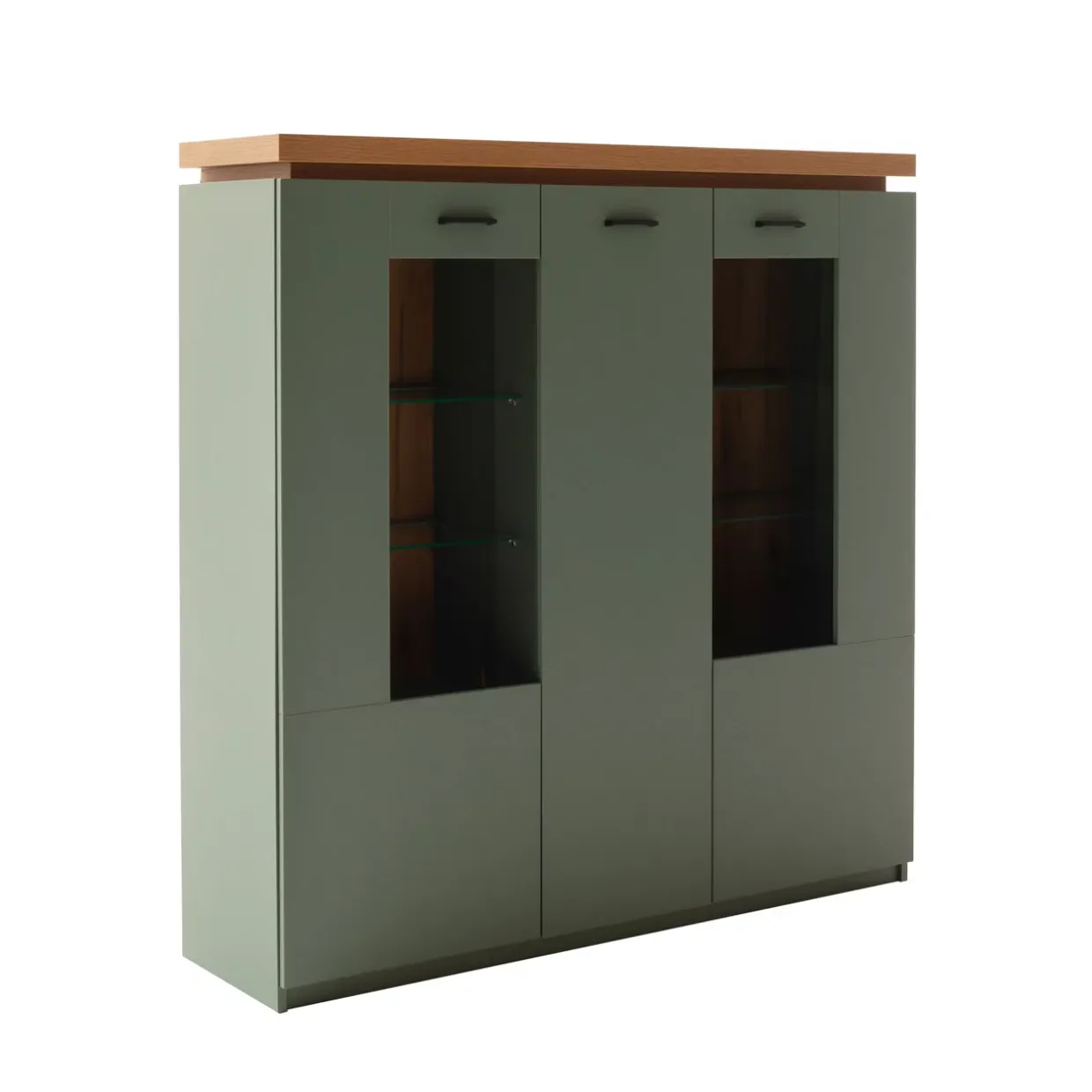 Sanft gedämpfte Türen und Schubladen bieten nicht nur ein komfortables Nutzungserlebnis, sondern schützen auch vor abrupten Schließungen. Die Farbgestaltung in Eiche und Salbei verleiht dem Highboard eine natürliche und zugleich frische Ausstrahlung.