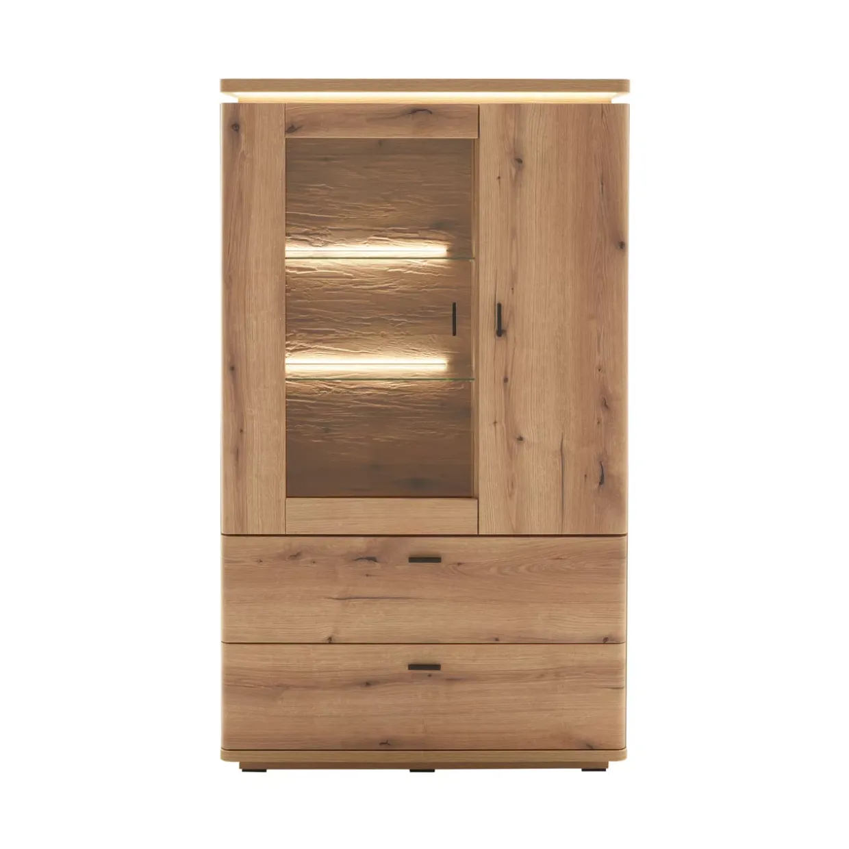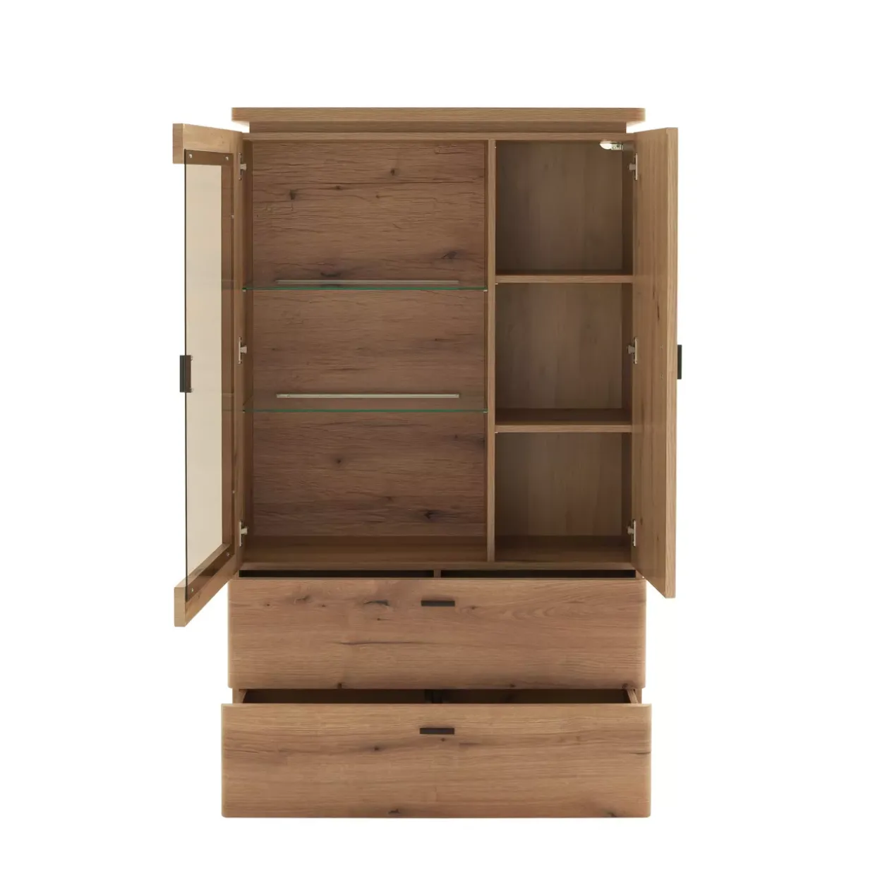 SALINA HighboardEiche Evoke, eine Farbe, die Wärme und Modernität harmonisch vereint, prägt dieses Highboard. Eine Kombination aus Glas und Holzwerkstoff sorgt für eine stilvolle Ästhetik und robuste Langlebigkeit. Die klare Linienführung des modernen Designs fügt sich nahtlos in verschiedene Raumkonzepte ein und schafft eine Atmosphäre von Eleganz und Raffinesse.Das Highboard überzeugt nicht nur durch seine äußere Erscheinung. Eine integrierte LED-Beleuchtung im Oberboden setzt gezielte Akzente und lässt Ihre Lieblingsstücke im besten Licht erscheinen. Ob in einem Wohnzimmer, Esszimmer oder Büro, es bietet vielseitige Einsatzmöglichkeiten und passt sich Ihren Bedürfnissen an.Die Verwendung hochwertiger Materialien garantiert nicht nur eine ansprechende Optik, sondern auch eine pflegeleichte Handhabung. Durch die Kombination aus Glas und Holzwerkstoff wird eine harmonische Balance zwischen Transparenz und Stabilität erreicht, was dem Möbelstück eine besondere Leichtigkeit verleiht.Ein Highboard, das nicht nur als Stauraum dient, sondern auch als dekoratives Element in Ihrem Zuhause fungiert. Die durchdachte Gestaltung und die hochwertige Verarbeitung machen es zu einem zeitlosen Begleiter in Ihren vier Wänden. Ein Möbelstück, das sich durch Funktionalität und Stil auszeichnet, ohne dabei aufdringlich zu wirken.