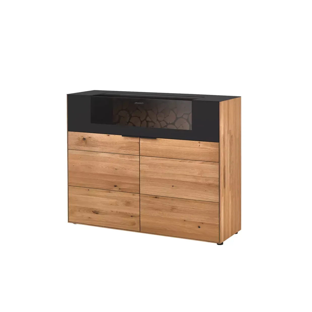 Die edle Wildeiche massiv soft gebürstet verleiht dem Highboard Varedo eine moderne und zeitlose Eleganz. Ansprechend kombiniert, treffen hier hochwertige Materialien wie Holz und Metall aufeinander und formen ein harmonisches Gesamtbild. Die charmanten Vitrinenausschnitte aus carbonfarbigem Massivholz und die strukturiert pulverbeschichteten Metallteile setzen stilvolle Akzente.