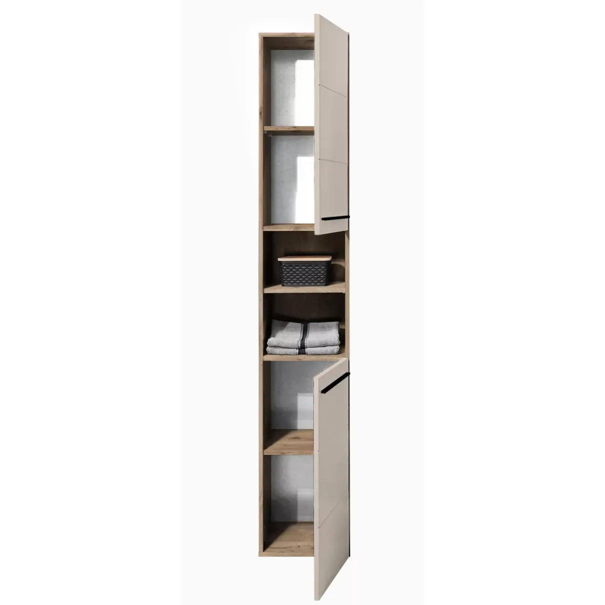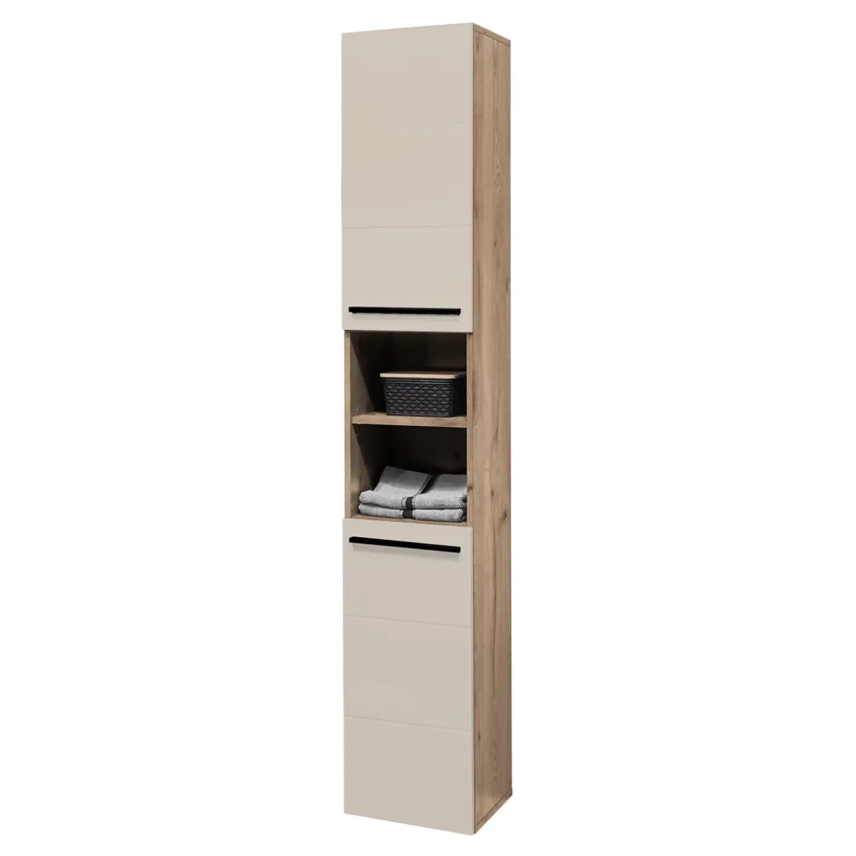 Mit seiner modernen Ästhetik fügt sich der Hochschrank nahtlos in zeitgemäße Wohnkonzepte ein. Die Farbpalette aus Viking Oak, Schwarz, Sand und Schwarz matt bietet vielseitige Kombinationsmöglichkeiten und passt sich elegant an unterschiedliche Raumgestaltungen an. Die glatte Oberfläche, die durch Melaminharzbeschichtung und Folierung veredelt ist, sorgt nicht nur für einen ansprechenden Look, sondern auch für Langlebigkeit und Pflegeleichtigkeit.