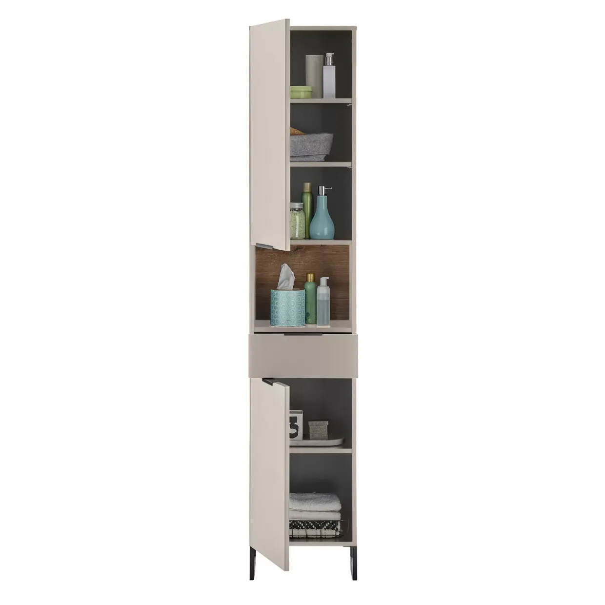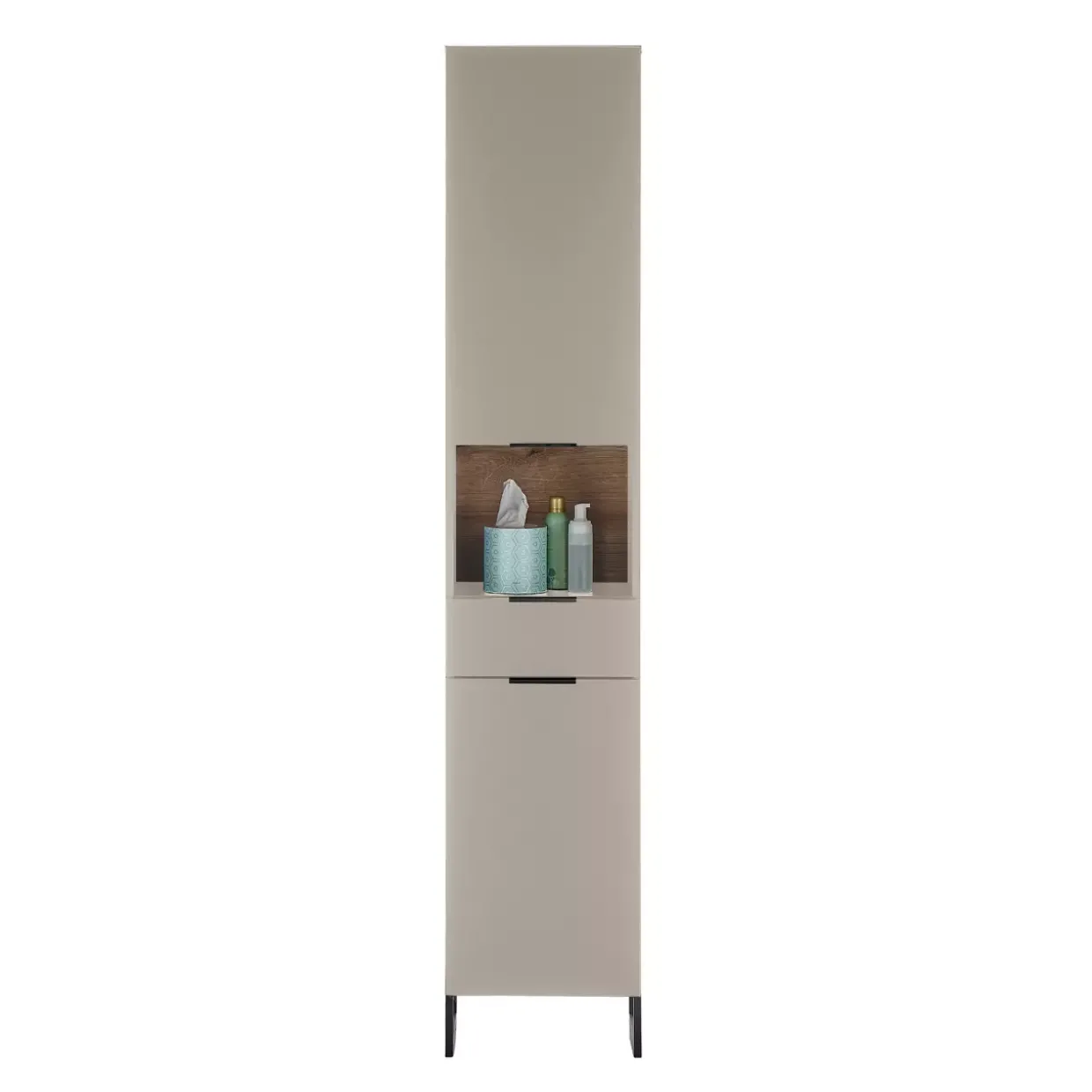 Zwei geräumige Fächer bieten ausreichend Platz für all Ihre Badutensilien, während ein zusätzliches Fach die Organisation erleichtert und für Ordnung sorgt. Die moderne Gestaltung des Schranks wird durch die klare Linienführung und das dezente Design unterstützt, was ihn zu einem zeitlosen Begleiter in Ihrem Bad macht.