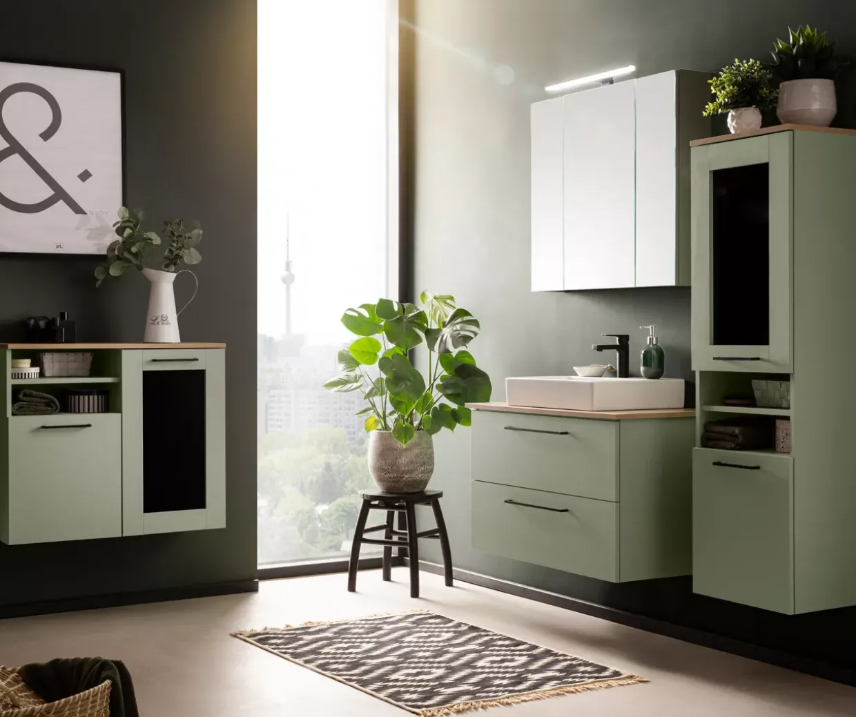 | Color | Abdeckplatte Eiche / Rauchglas / Korpus Pistazie / Front Pistazie / Griffe schwarz matt |