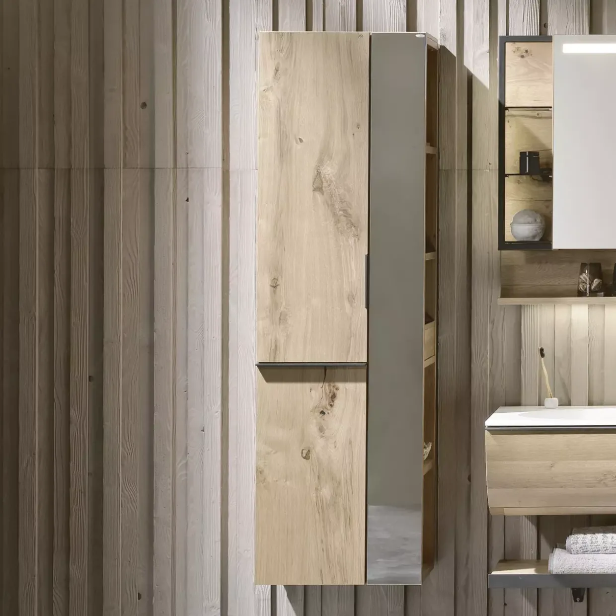 Dieser Hochschrank bietet nicht nur stilvolle Ästhetik, sondern auch funktionalen Stauraum. Die untere Tür ist mit einer praktischen Wäschekippe ausgestattet, die den Alltag erleichtert. Darüber hinaus stehen Ihnen vier feste Böden in einem offenen Regal zur Verfügung, um Handtücher oder Pflegeprodukte ordentlich zu verstauen.