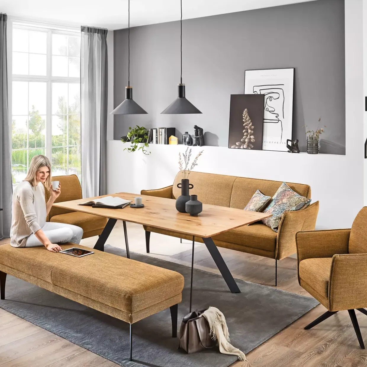 Der elegante Stil des modernen Designs trifft auf die warme Nuance von Curry und verleiht dem Piatto-Dining Modell eine besondere Ausstrahlung. Diese Esszimmermöbel strahlen eine zeitgemäße Eleganz aus und setzen einen stilvollen Akzent in Ihrem Zuhause. Das verwendete Material aus hochwertigem Stoff sorgt für einen angenehmen Sitzkomfort und eine einladende Atmosphäre bei jedem Dinner.