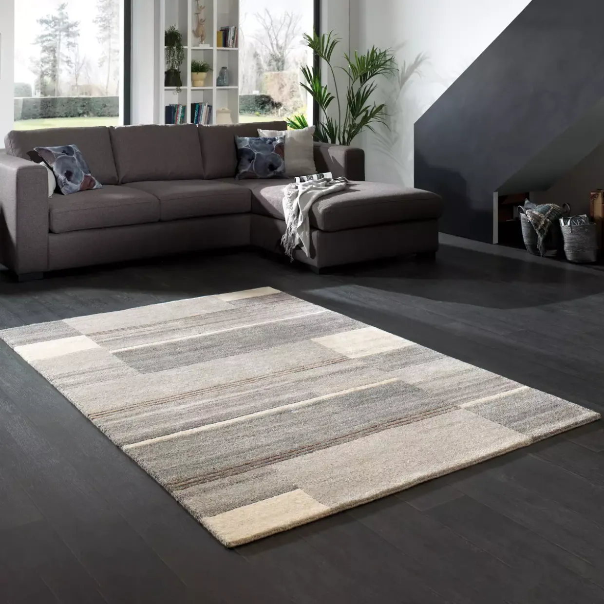Sehr harmonisch fügen sich die geometrischen Flächen und die dezente Farbgebung zu einem Gesamtbild zusammen. Durch die handwerkliche Verarbeitung von 60% Schurwolle, 20% Viskose und 20% Baumwolle