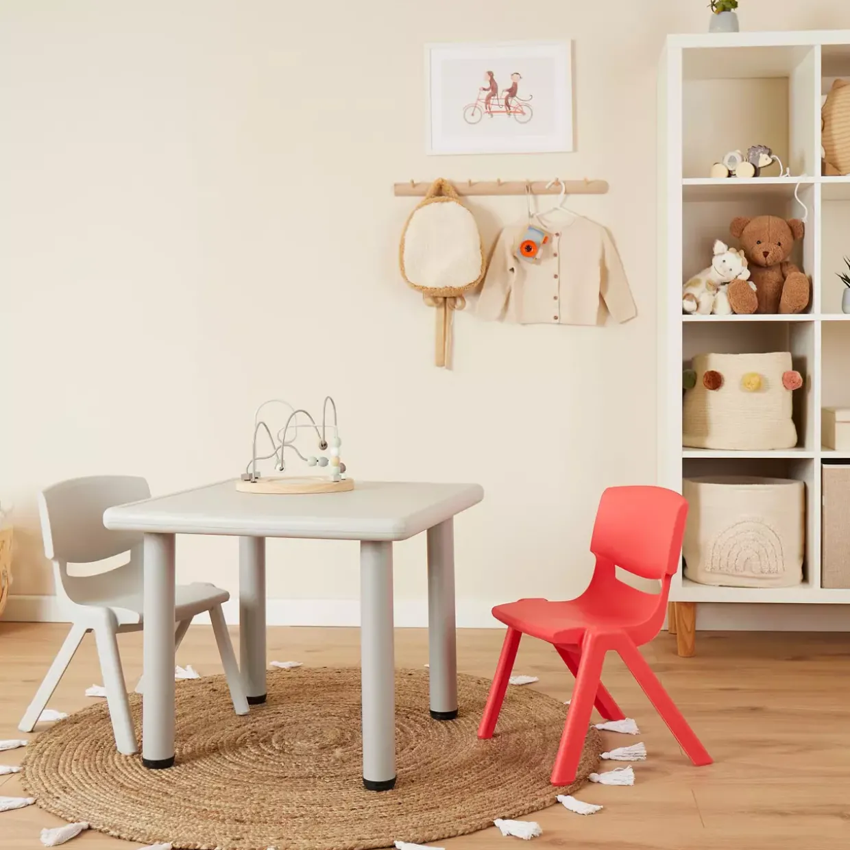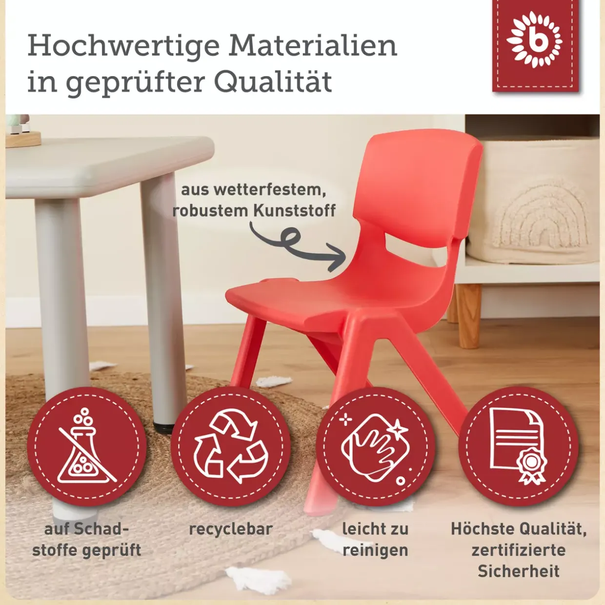 Der Kinderstuhl wurde aus hochwertigem Kunststoff gefertigt, der für seine Robustheit und Langlebigkeit bekannt ist. Dieses Material macht den Stuhl besonders leicht und einfach zu transportieren, sodass er problemlos an verschiedenen Orten im Haus verwendet werden kann. Dank seiner witterungsbeständigen Eigenschaften eignet sich der Stuhl für den ganzjährigen Einsatz, sowohl drinnen als auch draußen. Er bietet eine stabile Sitzgelegenheit und wurde speziell für die Bedürfnisse und die Sicherheit von Kindern entwickelt, ohne Kompromisse bei Stil und Komfort einzugehen.