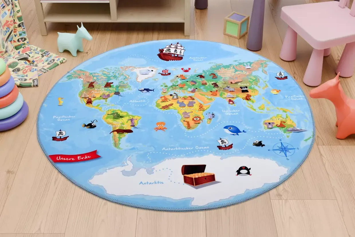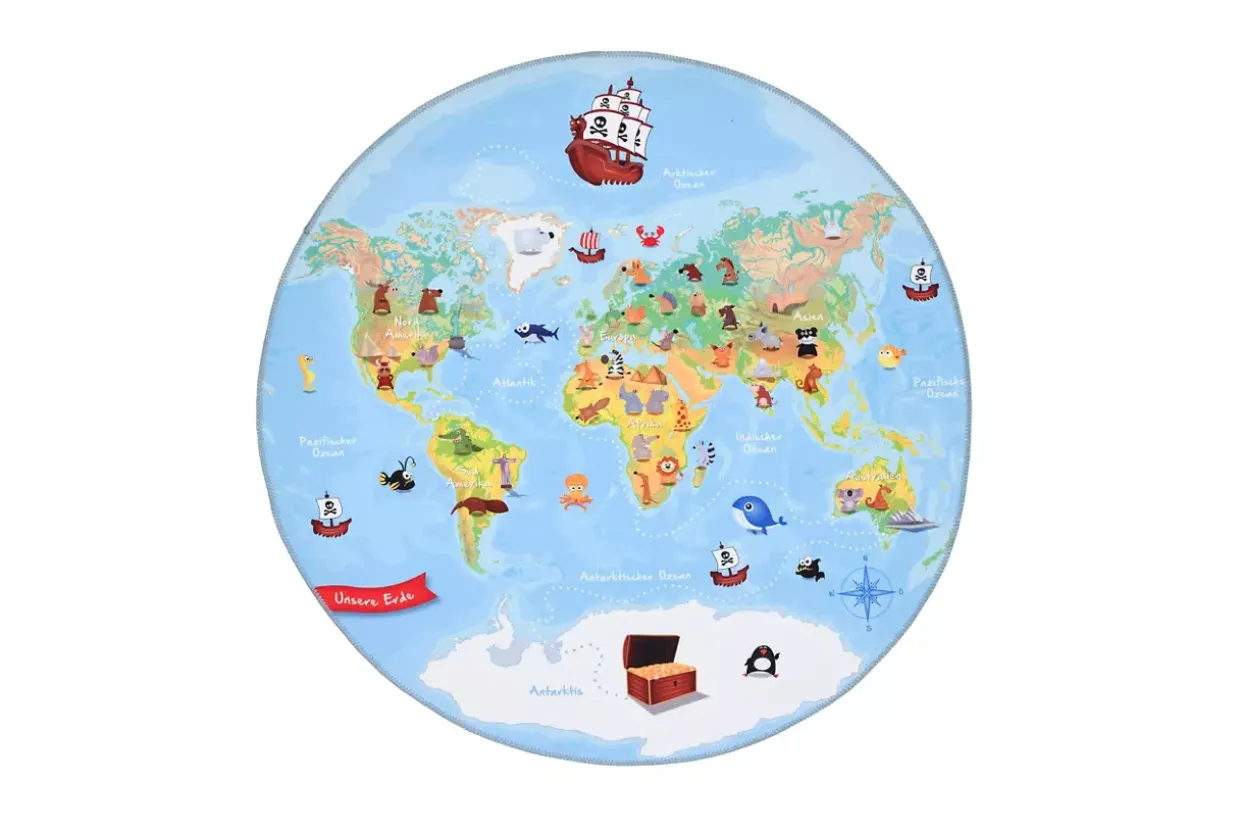 Ein Hauch von Abenteuer zieht mit diesem runden Kinder- und Spielteppich ins Kinderzimmer ein. Blau wie die Ozeane, bringt er die Weltkarte direkt auf den Boden und lädt kleine Entdecker dazu ein, spielerisch die Kontinente zu erkunden. Mit seinem konventionellen Stil fügt er sich nahtlos in jede Einrichtung ein und bleibt dabei stets ein Blickfang.
