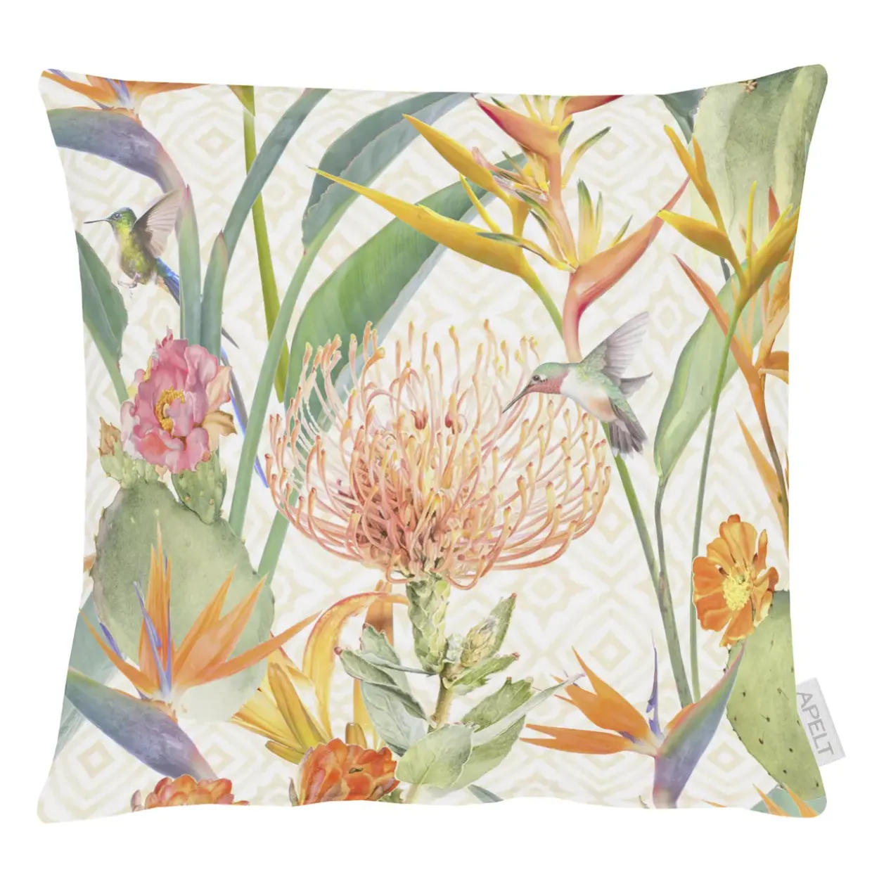 Exotische Blüten und Pflanzen zieren die bedruckte Oberfläche dieser Kissenhülle, die jedem Raum einen Hauch von Sommer verleiht. Der moderne Stil wird durch ein quadratisches Format von 49×49 cm unterstrichen, das sich harmonisch in jedes Wohnambiente einfügt. Die Kombination aus Baumwolle und Polyester sorgt für eine angenehme Haptik und Langlebigkeit, während die bunte Farbgebung frischen Wind in Ihre Wohnräume bringt.