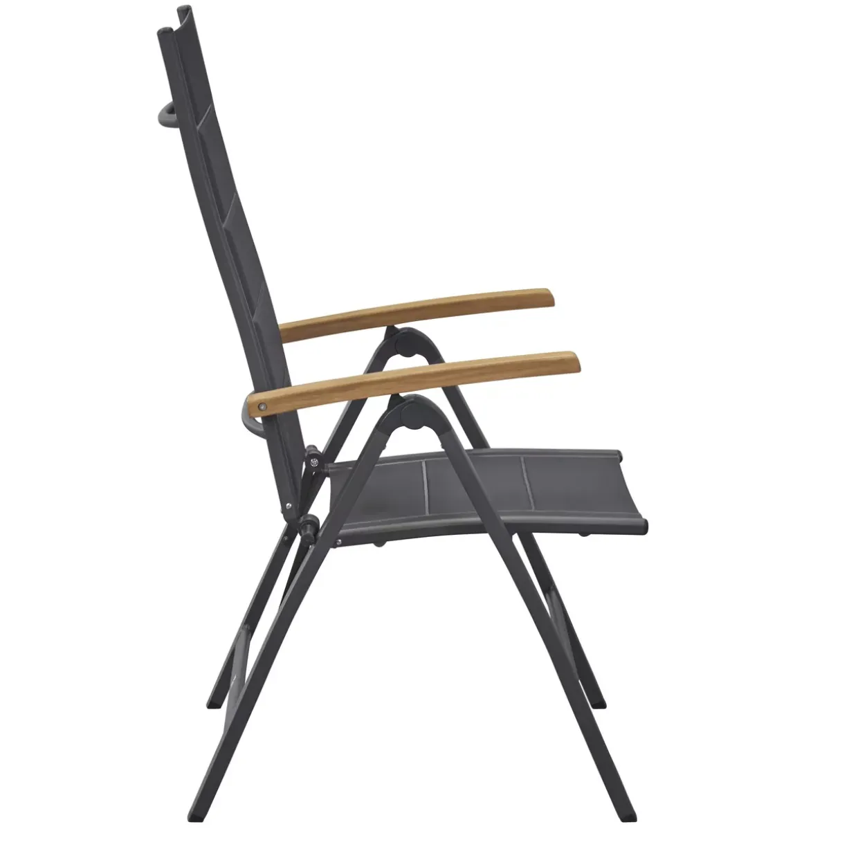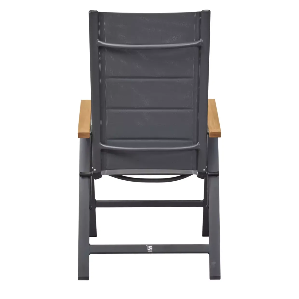 mit Teak-Armlehnen; Sitz- und Rückenlehne aus Textilene, gepolstert; Farbe: anthrazit; Gestell: Aluminium, anthrazit; mit Teakholz-Armlehnen