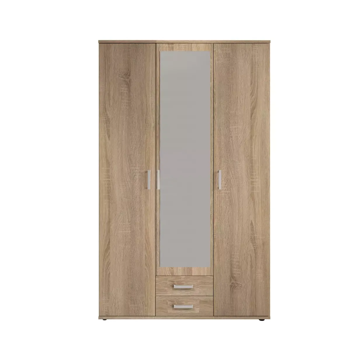 KARL Kleiderschr. 3-trg Eiche Sonoma m. Spiegel BHT ca. 120x196x54 cmEichenholz in der Ausführung Sonoma bringt einen Hauch von Natur in jeden Raum. Der moderne Stil dieses Drehtürenschranks passt sich mühelos verschiedensten Einrichtungsstilen an und bietet zugleich eine elegante Lösung für die Aufbewahrung Ihrer Kleidung. Die geschmackvolle Integration von Spiegeln verleiht dem Raum eine zusätzliche Dimension und lässt ihn größer und heller erscheinen.Holzwerkstoffe machen den Schrank besonders langlebig und stabil, ohne dabei an Ästhetik einzubüßen. Drehtüren sind die klassische Wahl, wenn es darum geht, einen schnellen und unkomplizierten Zugang zu ermöglichen. Diese Türart ist ideal für Räume, in denen Schiebetüren nicht in Frage kommen.Überzeugend durch seine funktionale Gestaltung, bietet dieser Kleiderschrank ausreichend Platz für Ihre gesamte Garderobe. Egal, ob im Schlafzimmer oder im Ankleidezimmer, er fügt sich nahtlos in das Raumkonzept ein und ist sowohl für private als auch für gewerbliche Räume eine stilvolle Bereicherung. Die sorgfältige Auswahl der Materialien und das durchdachte Design machen diesen Kleiderschrank zu einem Möbelstück, das nicht nur durch seine Funktionalität, sondern auch durch seine stilvolle Erscheinung überzeugt. Lassen Sie sich von der Kombination aus Eleganz und Praktikabilität inspirieren und bereichern Sie Ihr Zuhause um ein zeitloses Möbelstück.