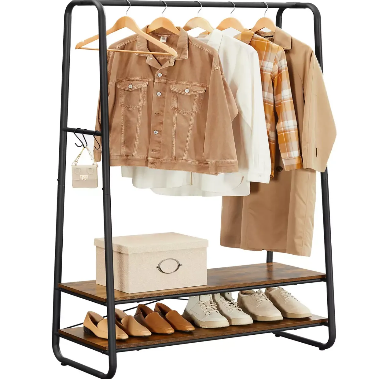 Holzwerkstoffe ergänzen das Eisen und schaffen eine warme, einladende Atmosphäre. Diese Materialkombination macht den Kleiderständer zu einem praktischen und zugleich ästhetischen Element in Ihrem Zuhause. Der Einsatz von Eisen sorgt dafür, dass der Kleiderständer langlebig und widerstandsfähig gegenüber täglichen Belastungen ist.