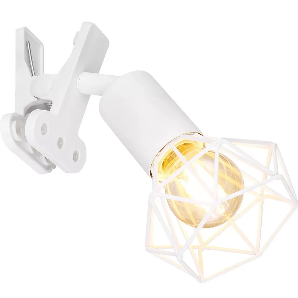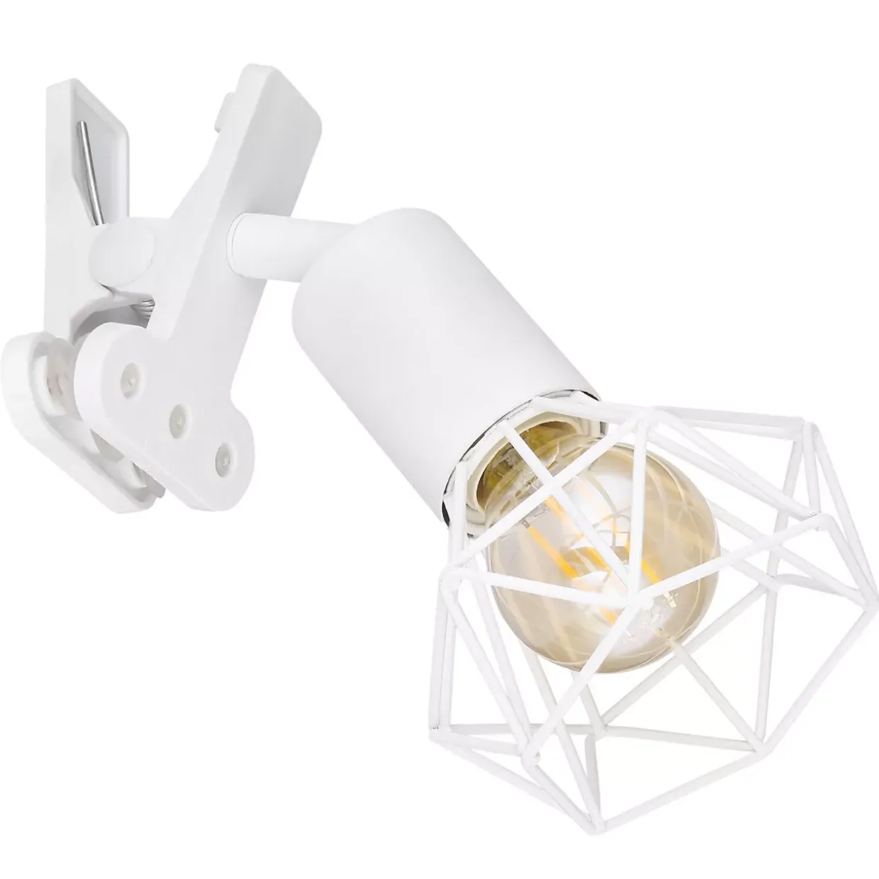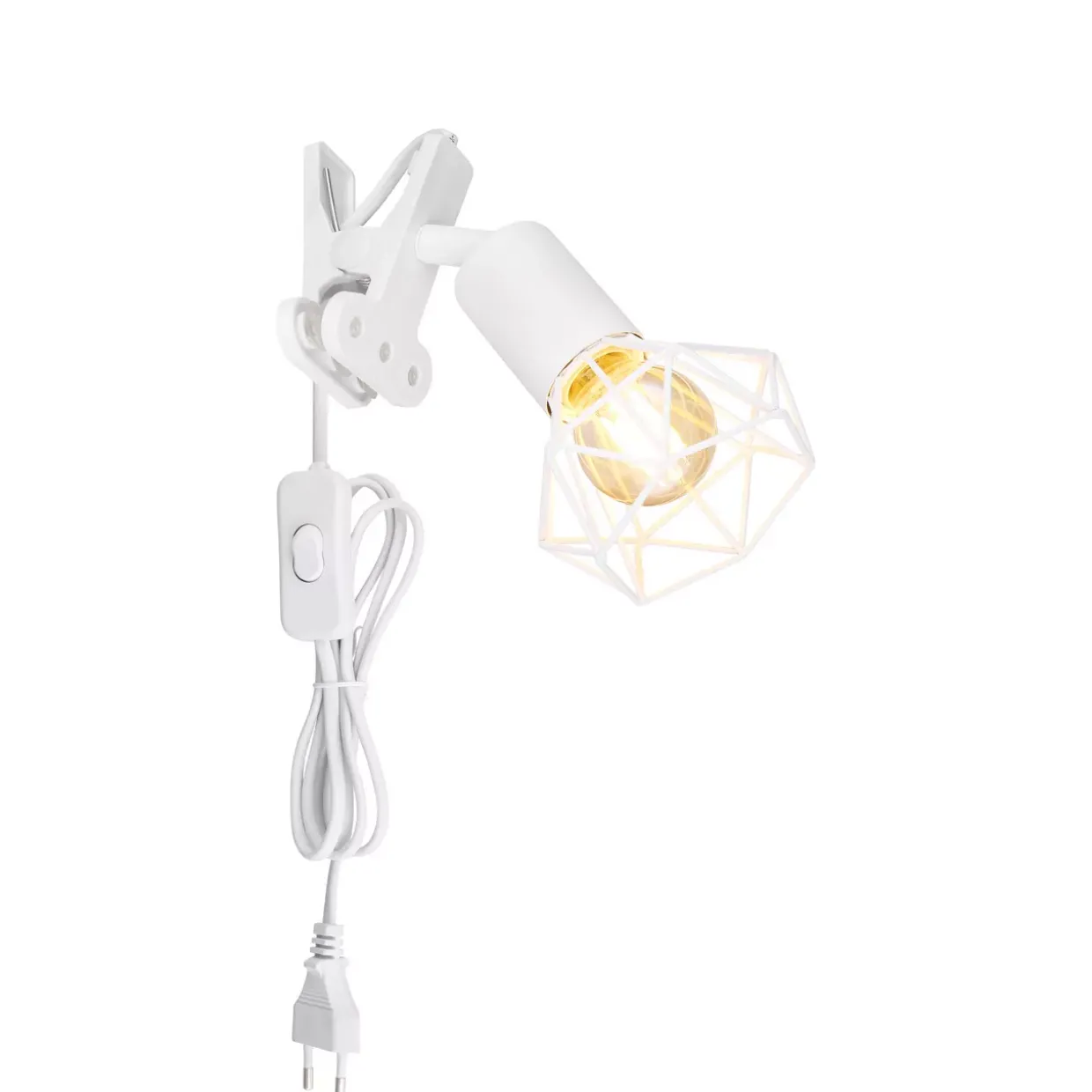 Klemmstrahler Metall weiß matt, Kunststoff, Metallgeflecht weiß matt, Kabel PVC Weiß, Wippschalter am Kabel, LxBxH: 170x92x180mm, Kabellänge 1500mm, exkl. 1x E14 230V