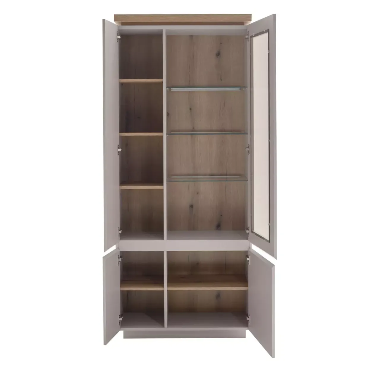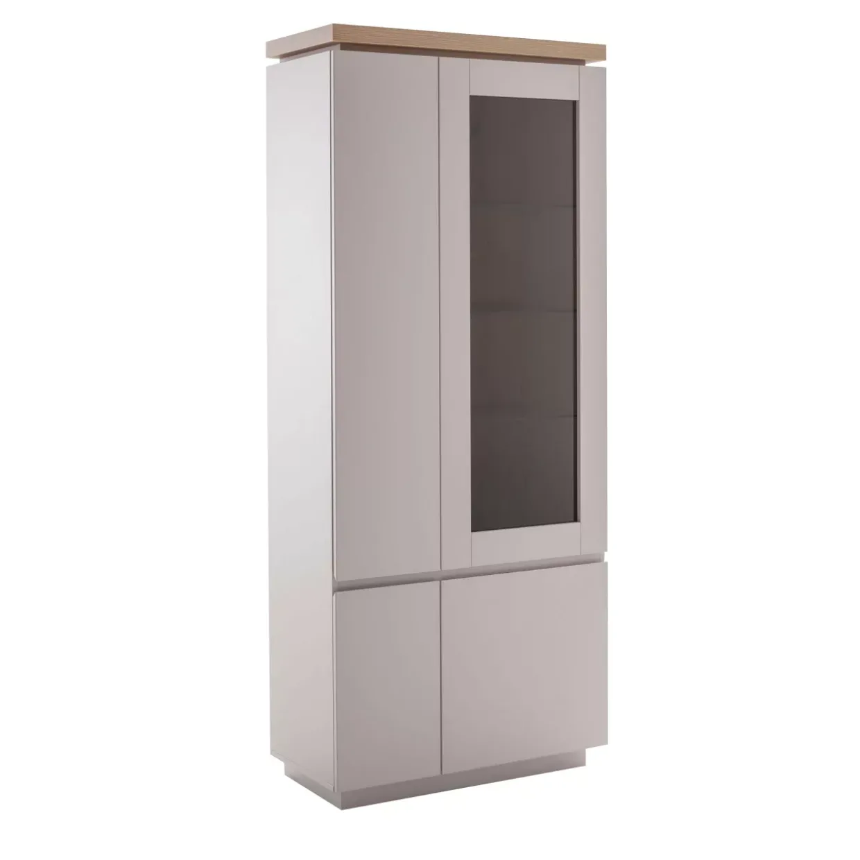 Ein elegantes Highlight für Ihr Zuhause ist die Kombi-Vitrine Remolino. Die moderne Ästhetik lässt sich perfekt in unterschiedliche Wohnstile integrieren. Melaminharzbeschichtete Oberflächen in Kaschmir verleihen der Vitrine eine stilvolle Optik und sorgen für Langlebigkeit. Die Kombination aus Holzwerkstoff und Glas schafft ein harmonisches Design, das durch Absetzungen in Eiche Evoke subtil akzentuiert wird.