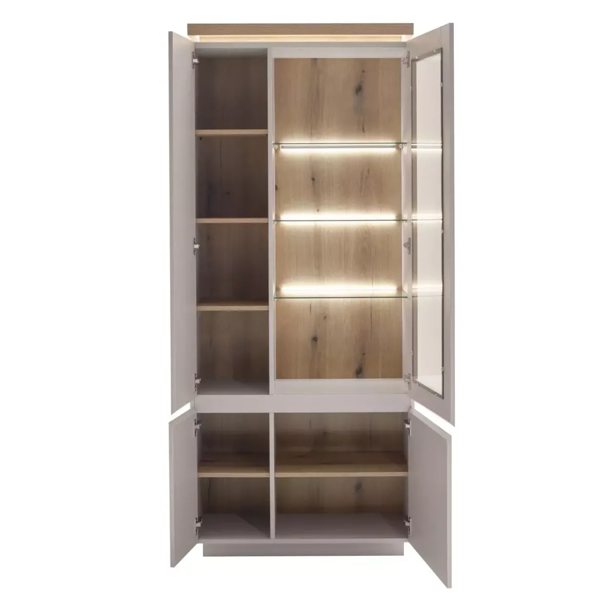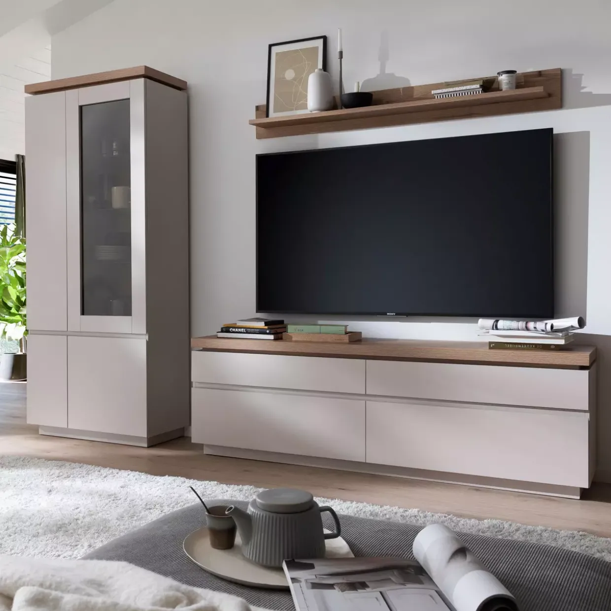 Die Remolino Kombi-Vitrine bietet nicht nur optische Anreize, sondern überzeugt auch durch funktionale Details. Klarglaselemente in der Front fügen sich harmonisch in das Gesamtbild ein und sorgen für eine offene und einladende Atmosphäre. Die raffinierte Farbgestaltung in warmen Tönen unterstützt eine behagliche Wohnatmosphäre.