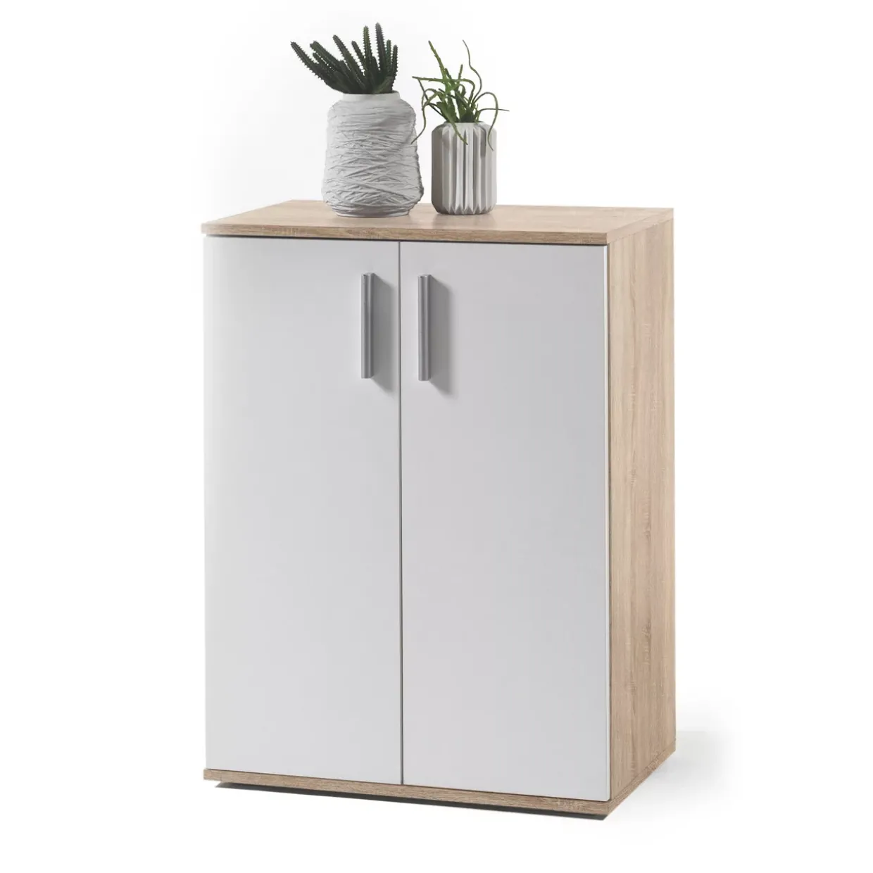 Die Kommode Bobby vereint modernes Design mit funktionaler Eleganz. Die klare Linienführung und die harmonische Kombination der Farbtöne Eiche sonoma, Eiche sonoma / Weiß und alufarbig verleihen dem Möbelstück eine ansprechende Optik, die sich nahtlos in verschiedenste Wohnstile einfügt.