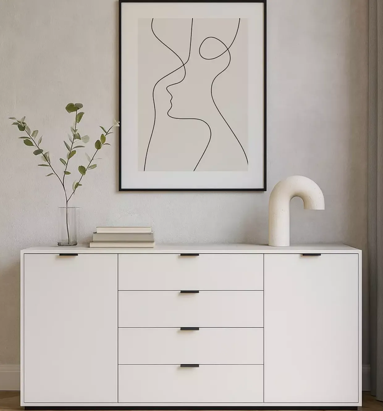 Eleganz trifft auf Funktionalität. Die modern gestaltete Kommode überzeugt durch ihre klare Linienführung und hochwertige Materialien. Ice white matt lack und schwarzgraue Akzente verleihen ihr eine zeitlose Optik, die sich mühelos in jedes Interieur einfügt. Diese Kommode eignet sich hervorragend für den ganzjährigen Einsatz.