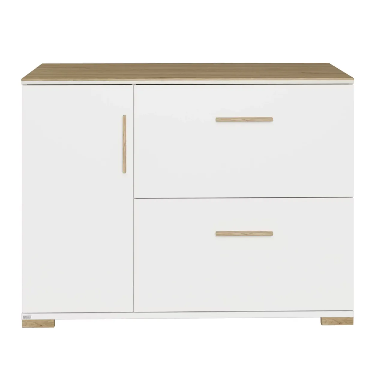 Scandi-Charme trifft auf Funktionalität in dieser eleganten Kommode. Der subtile Off-White-Ton harmoniert hervorragend mit der Deckplatte und den Griffen in Eiche-Montana-Dekor und verleiht jedem Raum eine zeitlose Ästhetik. Gefertigt aus hochwertigem Holzwerkstoff, bietet die Kommode sowohl Stabilität als auch Langlebigkeit.