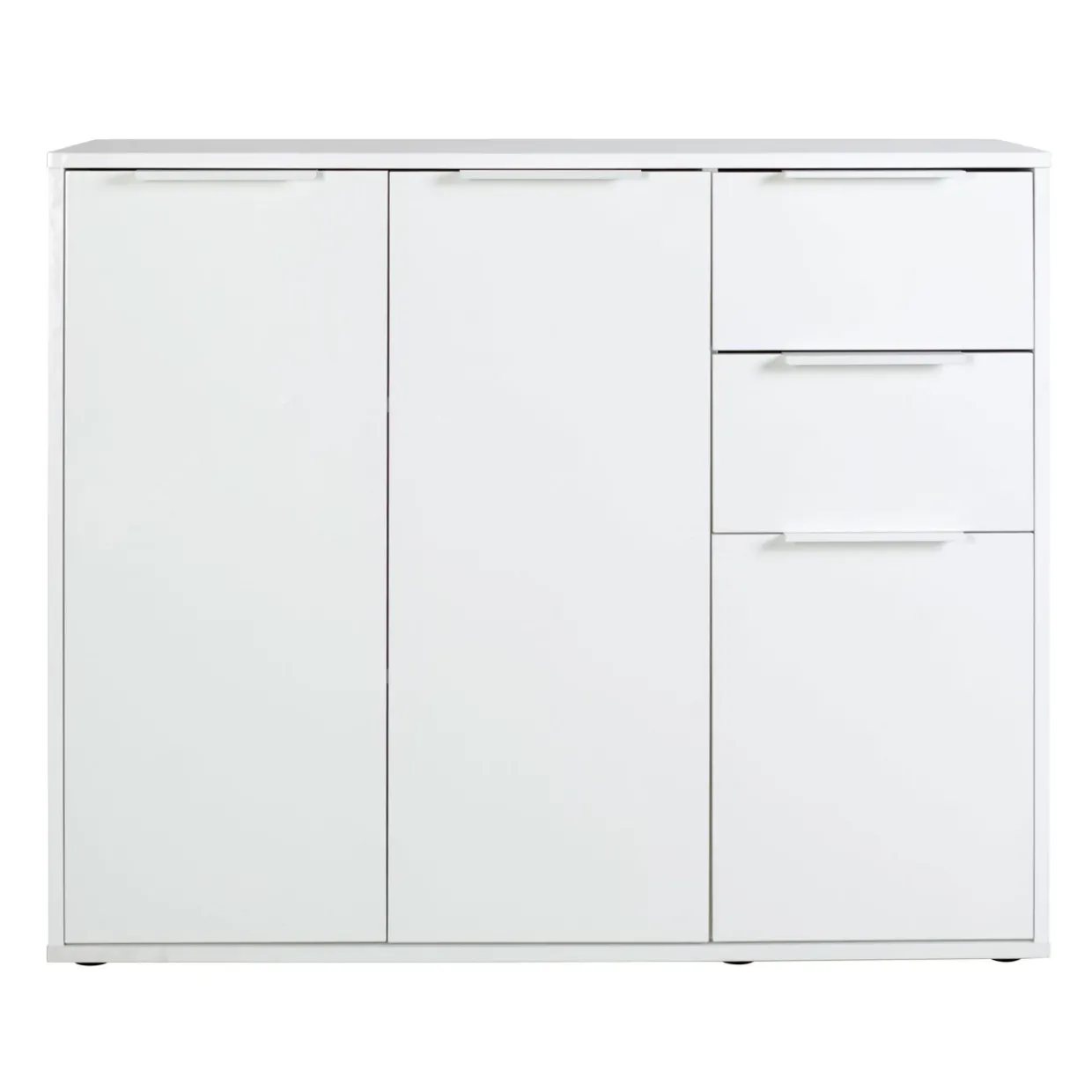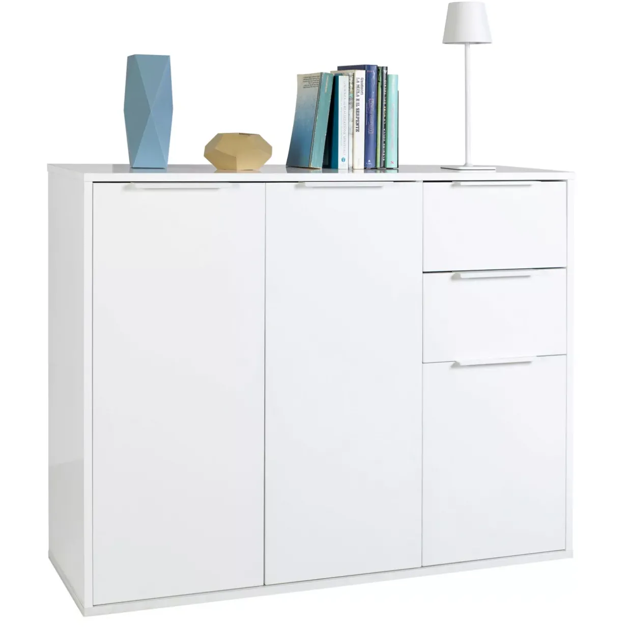 Hochglanz weiß verleiht der modernen Kommode eine elegante Ausstrahlung, die jeden Raum aufwertet. Die Kombination aus Holzwerkstoff und Metall sorgt für eine stabile und langlebige Konstruktion, die sowohl funktional als auch stilvoll ist. Ob im Wohnzimmer, Schlafzimmer oder Flur – dieses Möbelstück passt sich nahtlos in verschiedene Wohnumgebungen ein.Mit drei Türen und zwei Schubladen bietet die Kommode nicht nur reichlich Stauraum, sondern auch die Möglichkeit, Ordnung zu halten. Hinter den Türen lassen sich größere Gegenstände unauffällig verstauen, während die Schubladen ideal für kleinere Utensilien sind. Die Gleiter an der Unterseite ermöglichen eine leichte Verschiebung, ohne den Boden zu beschädigen, was besonders bei der Reinigung von Vorteil ist.Die melaminharzbeschichtete Oberfläche schützt vor Kratzern und Flecken, was die Pflege und Langlebigkeit der Kommode unterstützt. Das minimalistische Design fügt sich harmonisch in moderne Wohnkonzepte ein und setzt dennoch einen individuellen Akzent. Die Espresso Kommode ist nicht nur ein praktisches Aufbewahrungsmöbel, sondern auch ein gestalterisches Element, das Ihrem Zuhause eine besondere Note verleiht. Lassen Sie sich von der Verbindung aus Funktionalität und Ästhetik inspirieren und entdecken Sie neue Möglichkeiten der Raumgestaltung.