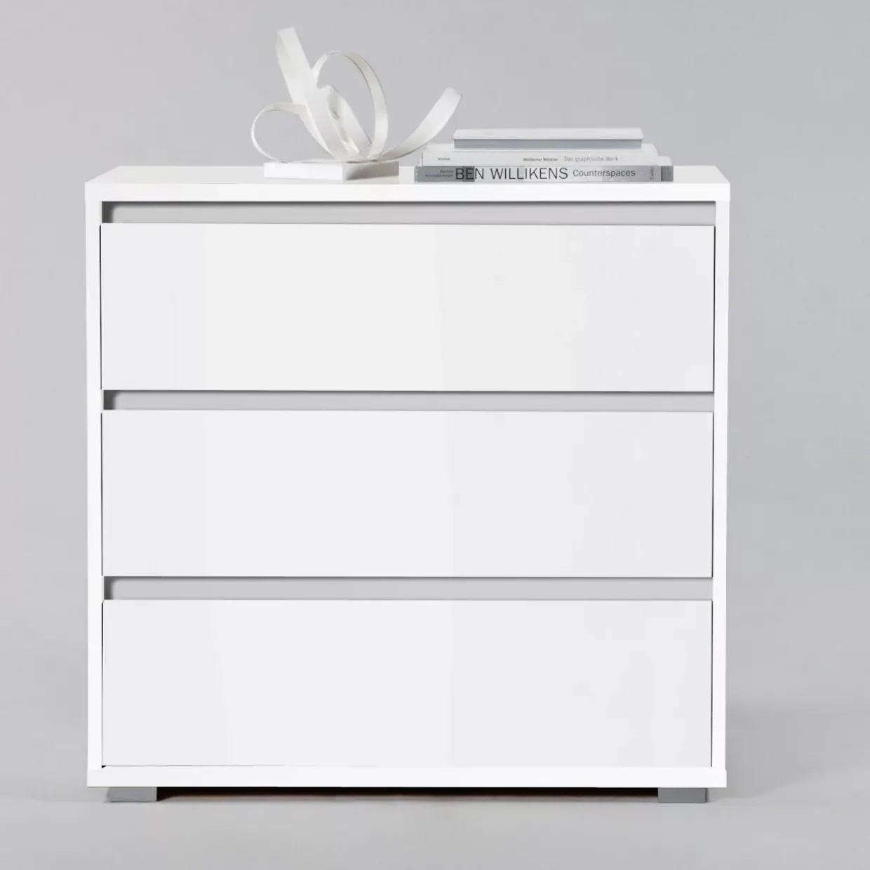 Eleganz und Funktionalität vereinen sich in dieser modernen Kommode. Das klare Weiß fügt sich harmonisch in jedes Raumkonzept ein und sorgt für eine zeitlose Atmosphäre. Drei großzügige Schubladen bieten ausreichend Platz für all Ihre Habseligkeiten, während die Oberfläche aus hochwertigem Holzwerkstoff für Stabilität und Langlebigkeit sorgt.