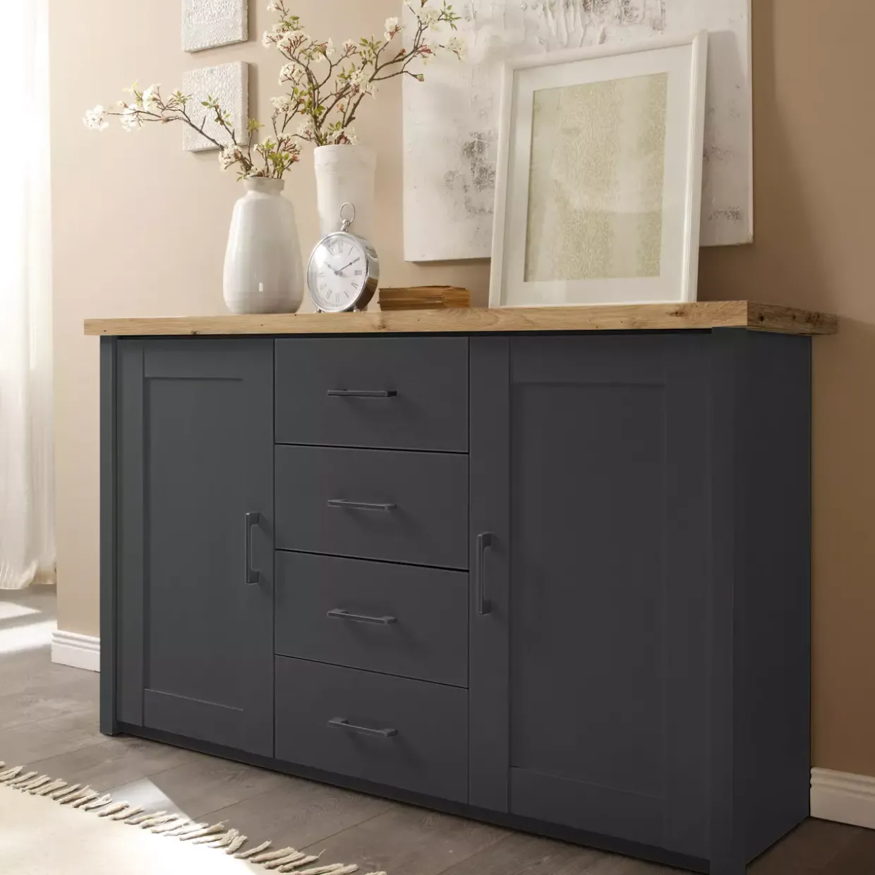 Graphitfarbene Akzente bringen einen Hauch von Modernität in das Cottage-Stil-Design dieser Kommode. Die Kombination aus Graphit und Artisan Eiche verleiht dem Möbelstück eine warme und zugleich elegante Ästhetik. Zwei Drehtüren bieten nicht nur funktionellen Stauraum, sondern auch einen charmanten Blickfang in jedem Raum.