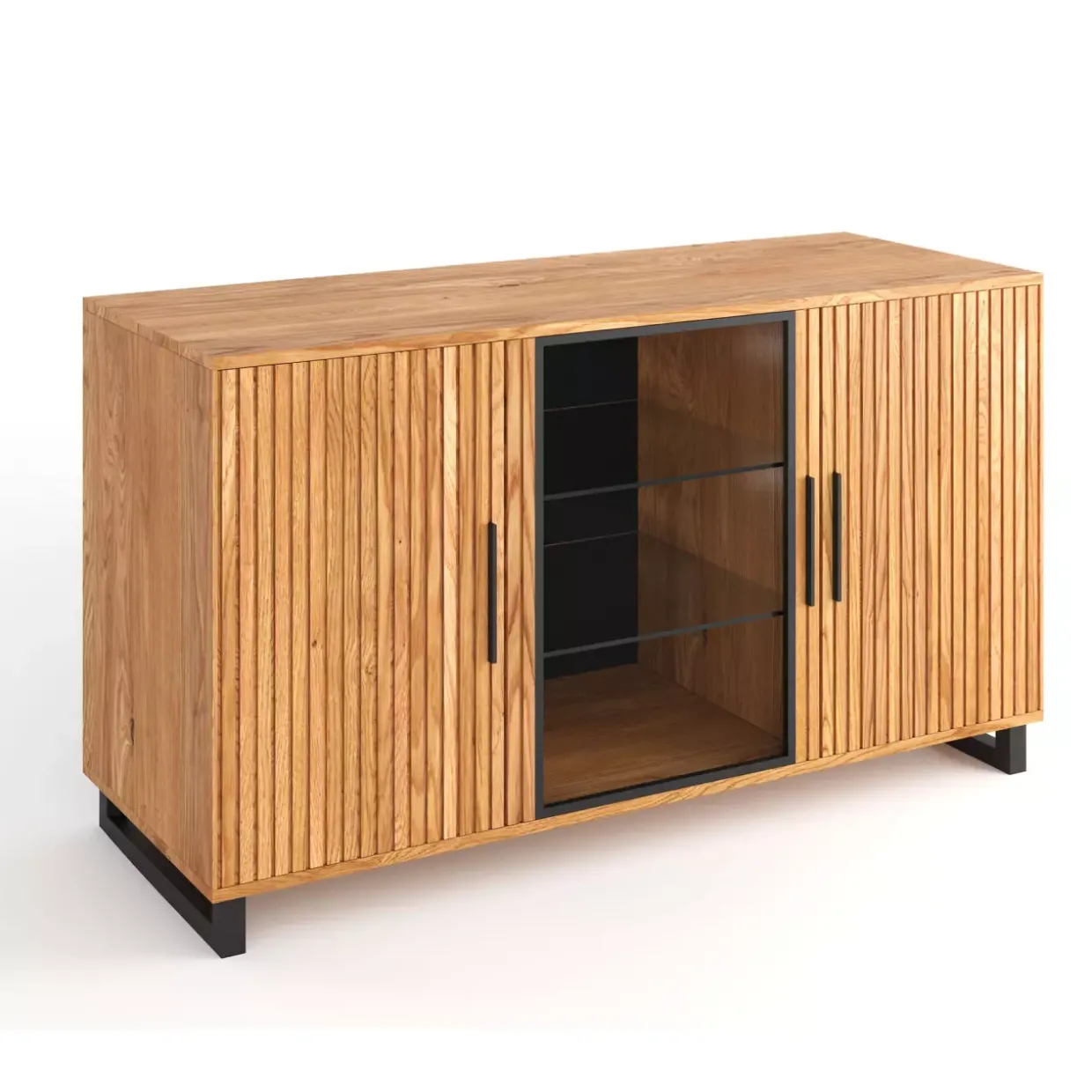 Mit einer beeindruckenden Kufenhöhe von etwa 10 cm hebt sich die Martha Kommode im Loft-Stil auf elegante Weise von anderen Möbelstücken ab. Die Kombination aus Eiche furniertem Holz, schwarzem Glas und Akustikpaneelen in Eiche sorgt für ein harmonisches und zugleich modernes Erscheinungsbild. Durch die Drehtüren mit Soft-Close-System wird Ihnen ein sanftes und geräuschloses Schließen ermöglicht, was den Komfort im Alltag erheblich steigert.
