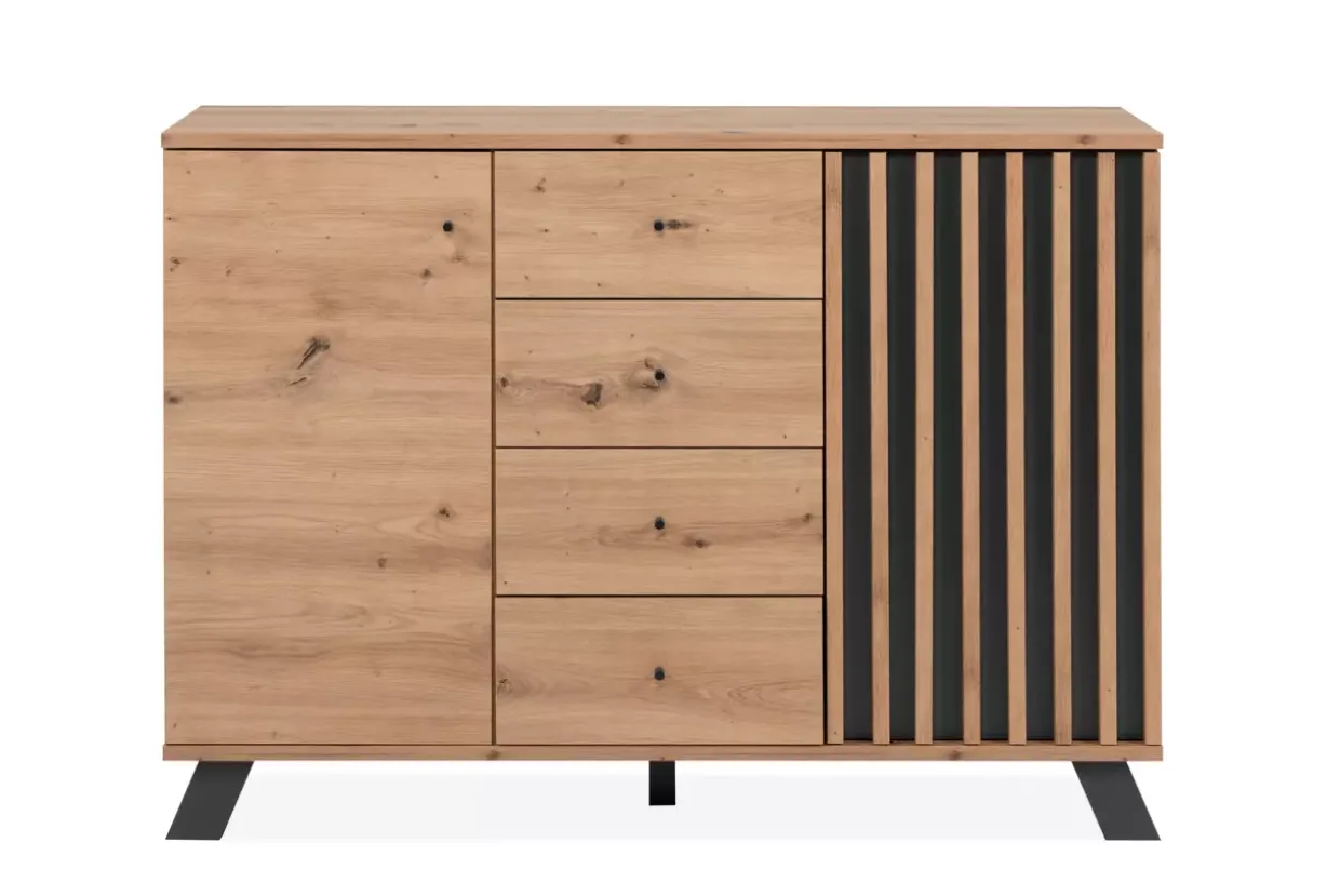 Eine gelungene Kombination aus Holzwerkstoff und Metall verleiht der Kommode eine moderne und elegante Note. Diese Medan-Kommode überzeugt durch ihre klare Linienführung und die stilvolle Farbkombination aus Artisan Eiche Nachbildung und Anthrazit. Mit zwei Drehtüren und vier Schubladen bietet sie ausreichend Stauraum für verschiedenste Gegenstände, sei es im Wohn- oder Schlafzimmer.