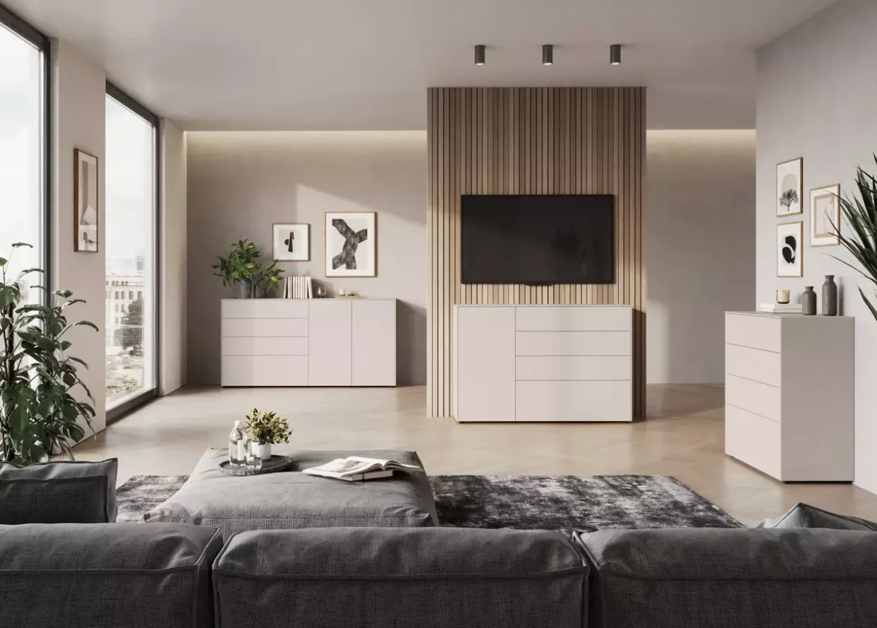 Die elegante Kommode in modernem Stil beeindruckt durch ihre kratzfeste und widerstandsfähige Oberflächenbeschichtung. In der warmen Farbe Kaschmir gehalten, fügt sie sich harmonisch in jedes Wohnambiente ein. Die Drehtür mit der innovativen Push-to-open-Technik ermöglicht ein sanftes Öffnen und Schließen durch leichten Druck. Hochwertige ABS-Kanten sorgen für Stoß- und Schlagfestigkeit, was die Langlebigkeit des Möbelstücks unterstreicht.