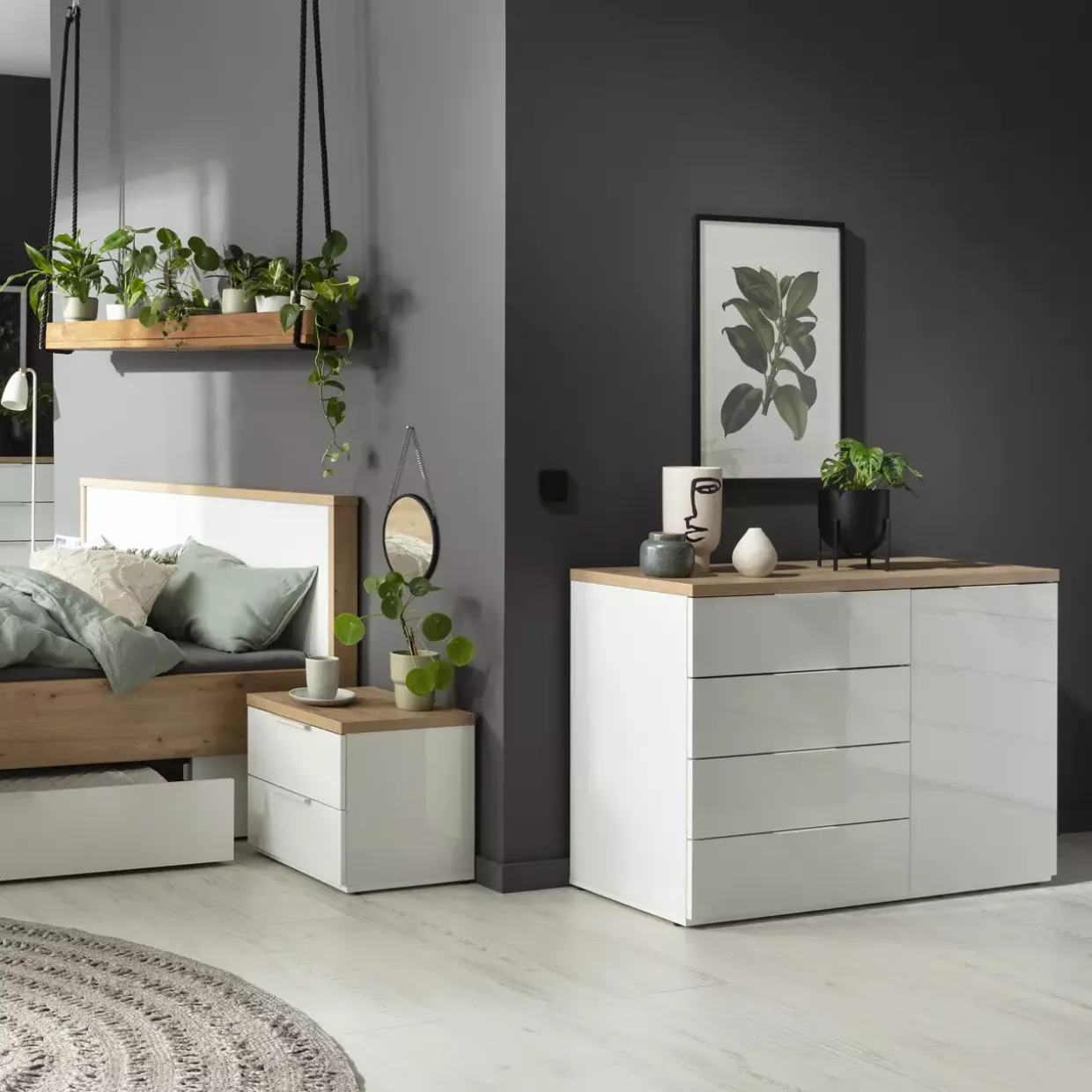 Die Kombination aus Artisan Eiche und weißem Hochglanz verleiht der Mundi Kommode eine moderne und zeitlose Ästhetik. Diese elegante Möbelstück fügt sich nahtlos in jedes zeitgemäße Interieur ein, während es gleichzeitig eine warme, einladende Atmosphäre schafft.