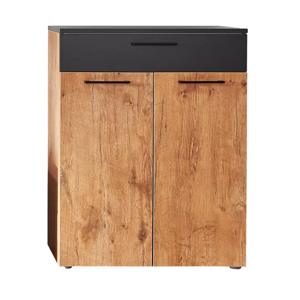 Die einzigartige Kombination aus Wildeiche Nachbildung und Anthrazit verleiht der Faro-Kommode ein modernes Flair. Zwei dieser eleganten Möbelstücke bereichern jeden Raum und fügen sich nahtlos in ein zeitgemäßes Wohnambiente ein. Die klaren Linien und das stilvolle Design werden durch die sorgfältige Materialauswahl aus Holzwerkstoff und Metall ergänzt. Praktisch und funktional, bieten die Drehtüren mit integrierten Türdämpfern ein sanftes und geräuscharmes Schließen.