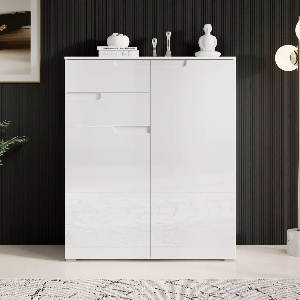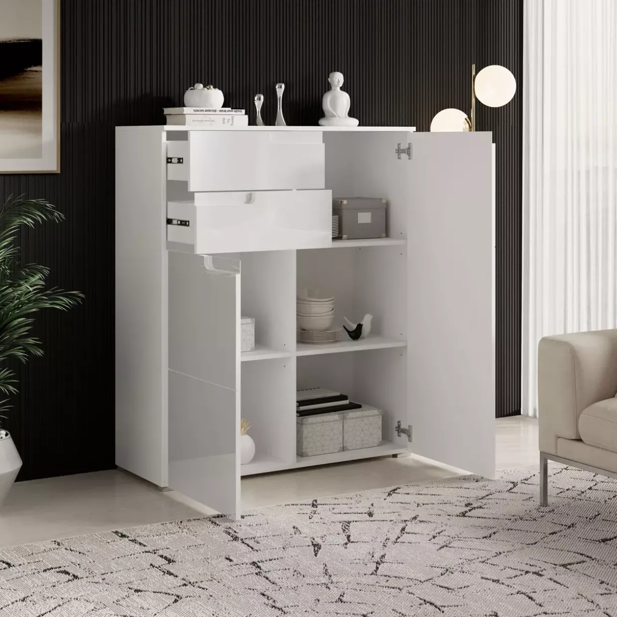 Weiße Hochglanzoberflächen verleihen der modernen Kommode ein elegantes und stilvolles Erscheinungsbild. In jedem Raum wird sie zu einem Blickfang und integriert sich nahtlos in verschiedene Einrichtungsstile. Der Holzwerkstoff, aus dem die Kommode gefertigt ist, überzeugt durch seine robuste Beschaffenheit und Langlebigkeit. Nicht nur funktional, sondern auch ästhetisch ansprechend, bietet die Kommode vielseitige Einsatzmöglichkeiten.