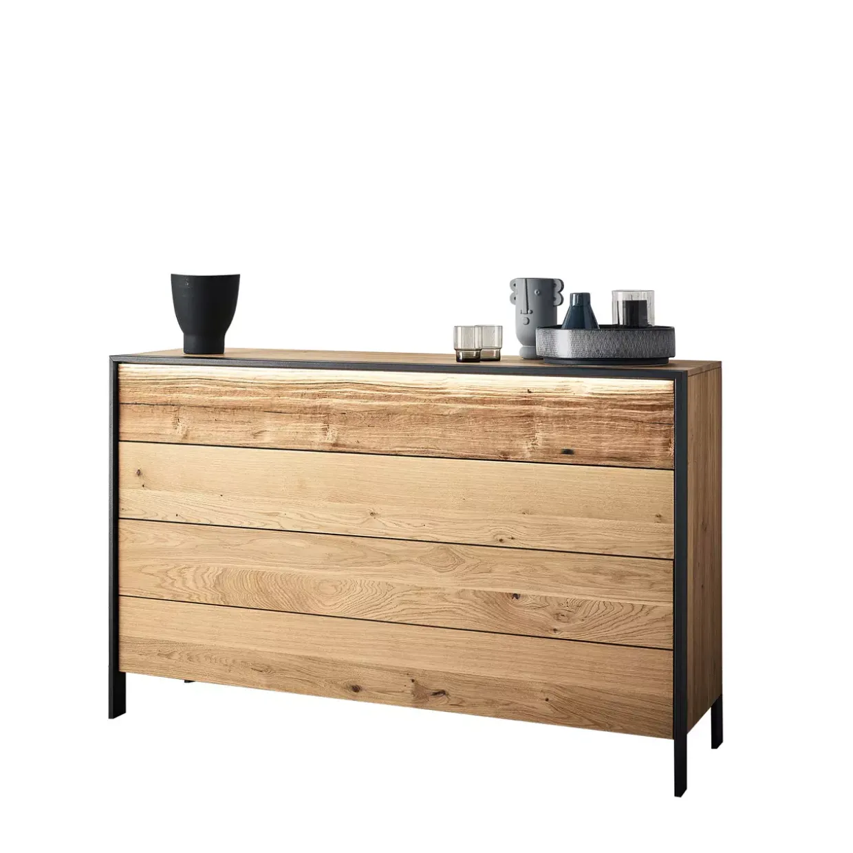 Ein Highlight dieser Kommode ist die besondere Materialausführung der oberen Schublade aus Spaltholz, die jedem Raum eine natürliche und zugleich moderne Note verleiht. Mit der Kombination aus massiv gebürstetem Wildeichenholz und dem modernen Stil ist die Steel Kommode mehr als nur ein Stauraummöbel. Sie verbindet Funktionalität mit einem ansprechenden Design, das zeitlos und elegant wirkt.