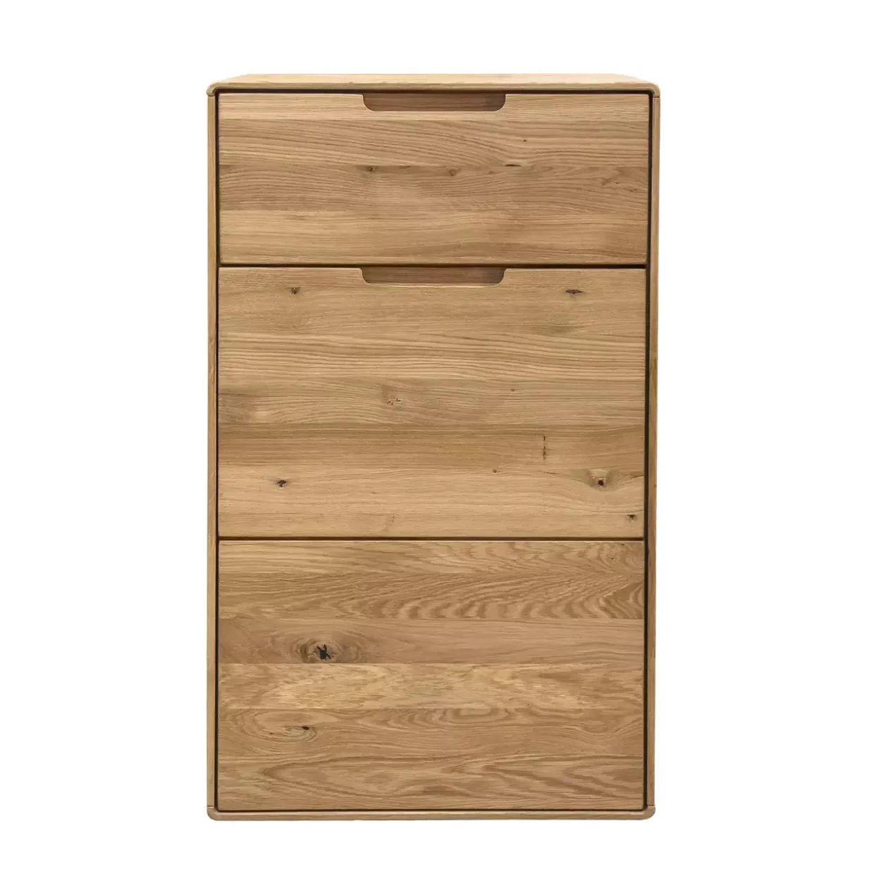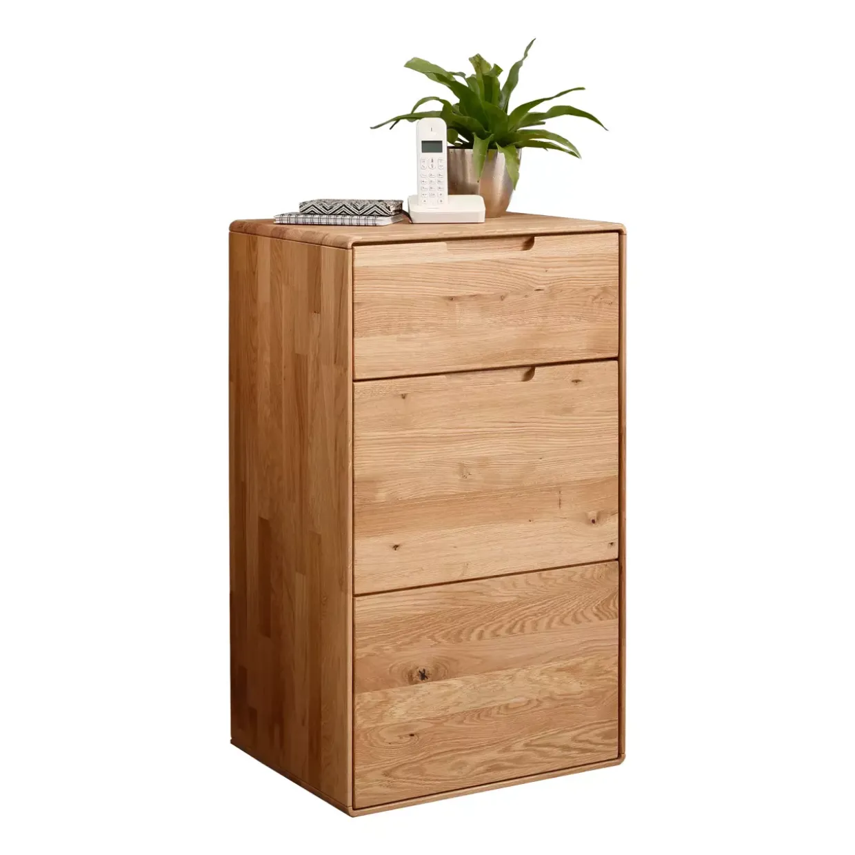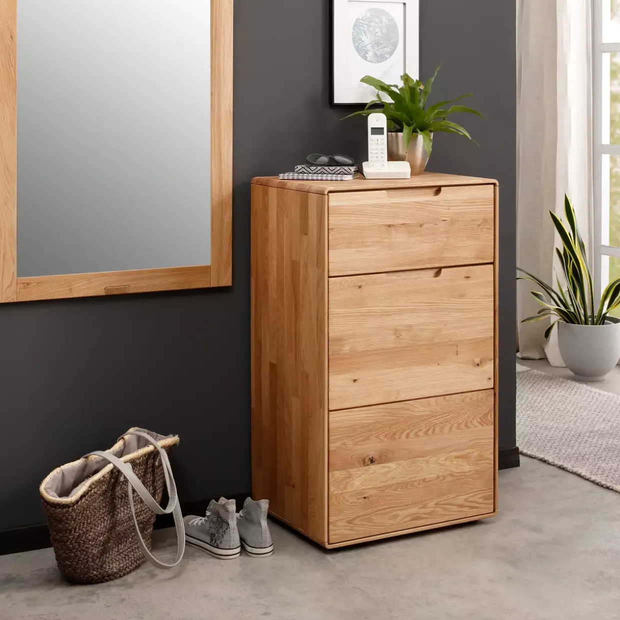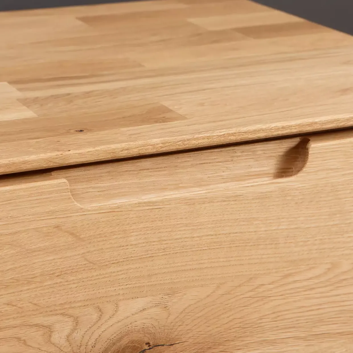 Sanft gesoftete Kanten verleihen dieser Kommode eine harmonische Ästhetik und laden zum Berühren ein. Die natürliche Schönheit der Wildeiche wird durch die geölte Oberfläche besonders hervorgehoben, wodurch die Holzmaserung elegant zur Geltung kommt. Das Design dieser Kommode strahlt zeitlose Eleganz aus und fügt sich nahtlos in ein natürliches Wohnambiente ein.
