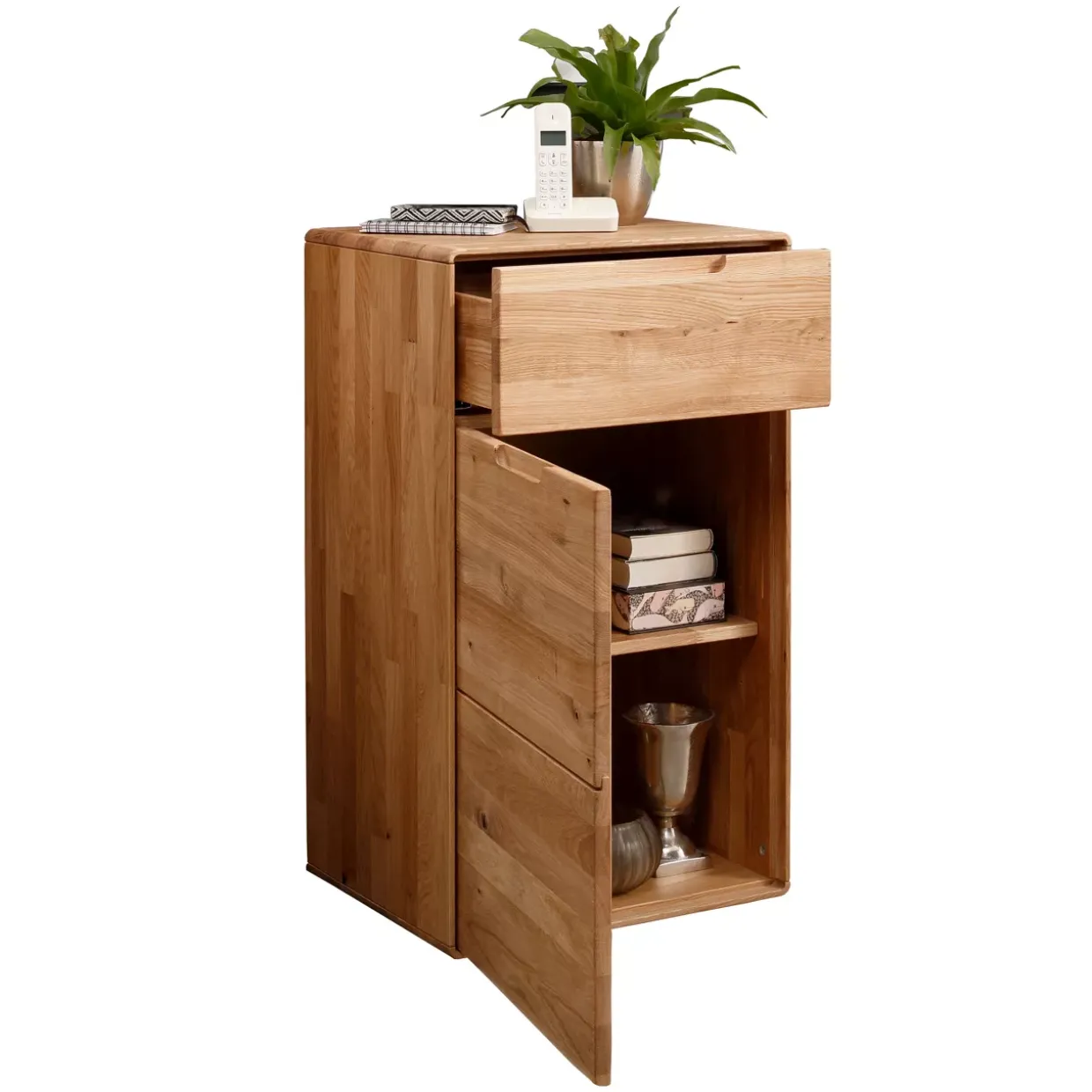 Mit einer Tür, einem Schubkasten und einem Holz-Regalboden bietet die Kommode vielseitige Aufbewahrungsmöglichkeiten für Ihre persönlichen Gegenstände. Die Tür verbirgt einen geräumigen Bereich, der durch einen Regalboden unterteilt ist und somit Ordnung und Übersicht schafft. Der Schubkasten eignet sich hervorragend für kleinere Gegenstände, die schnell zur Hand sein sollen.