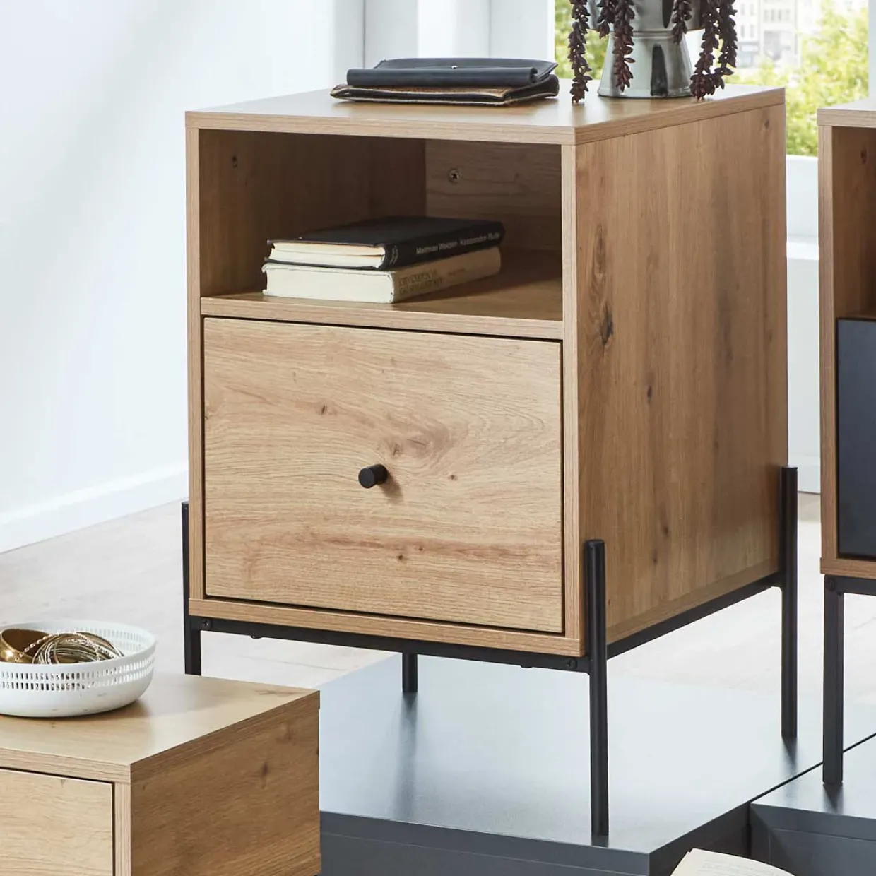 Ein besonderes Highlight ist das integrierte Soft-Close-System, das ein leises und sanftes Schließen der Schublade ermöglicht. So wird der Alltag nicht nur stilvoll, sondern auch geräuscharm gestaltet. Die klare Linienführung und die dezente Farbgebung in Schwarz und Eiche lassen die Konsole sowohl in Eingangsbereichen als auch in Wohn- oder Arbeitszimmern glänzen.