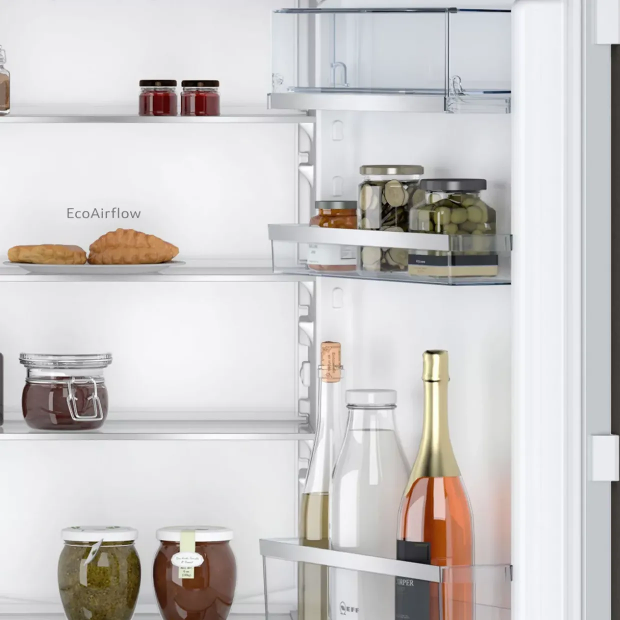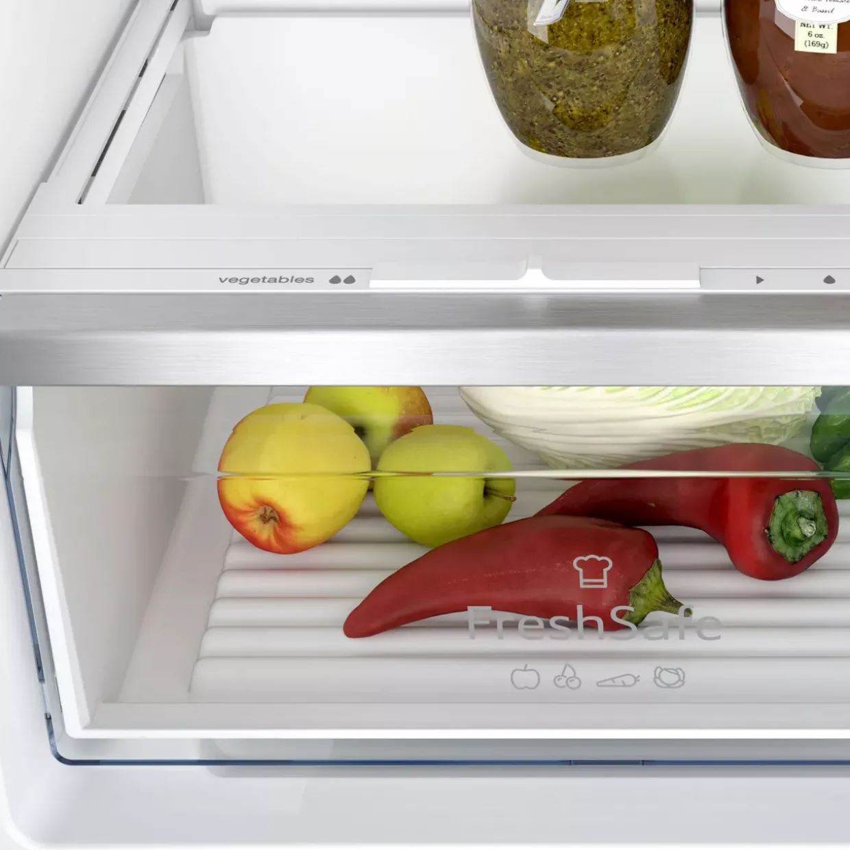 Das Design verbindet Kunststoff und Metall in einem eleganten, modernen Stil, der sich harmonisch in verschiedenste Kücheneinrichtungen einfügt. Eine helle LED-Beleuchtung sorgt dafür, dass Sie jederzeit den optimalen Überblick über Ihre Vorräte behalten. Praktische Details wie drei Eierablagen und eine Eiswürfelschale ergänzen die Funktionalität und machen das Einräumen und Entnehmen von Lebensmitteln besonders komfortabel.