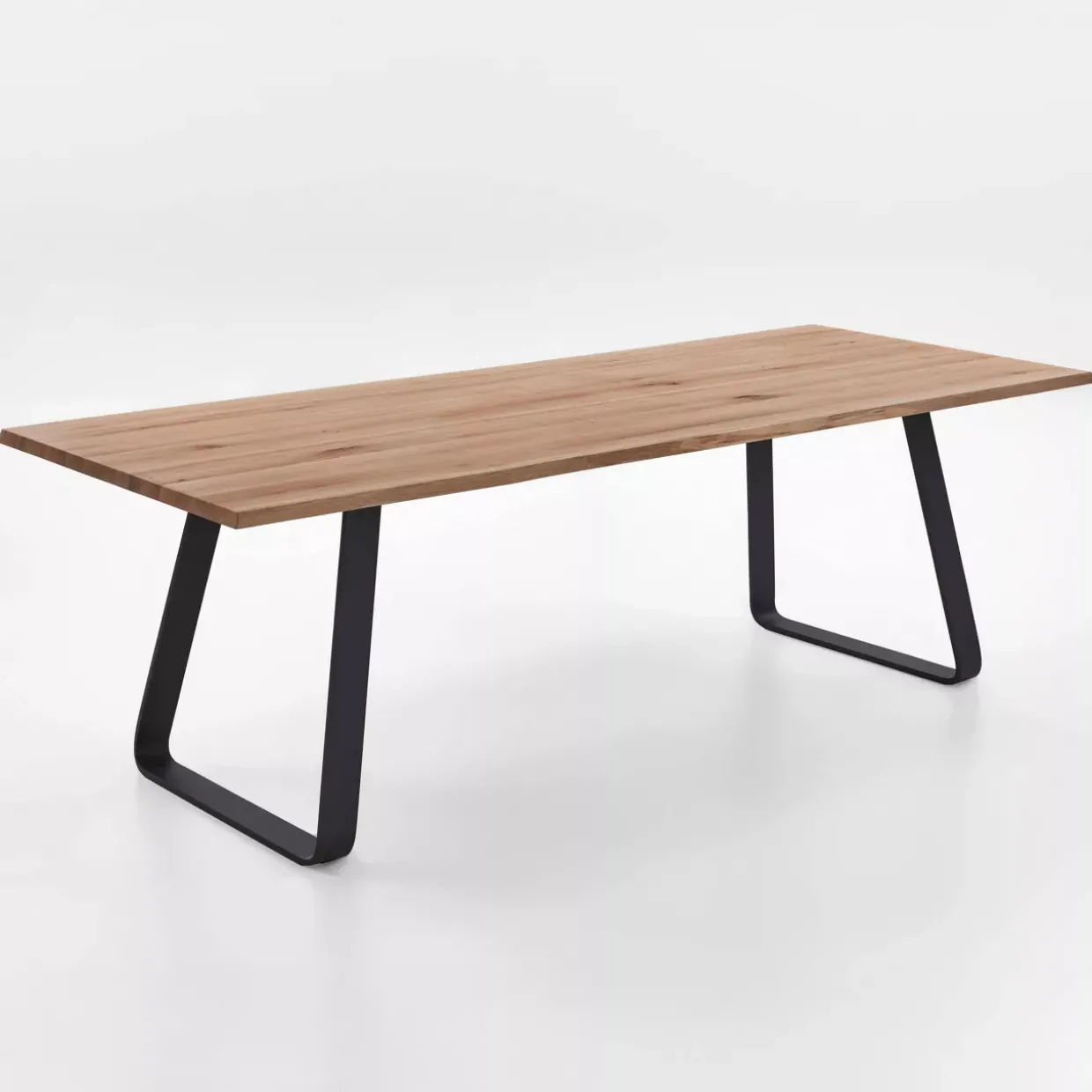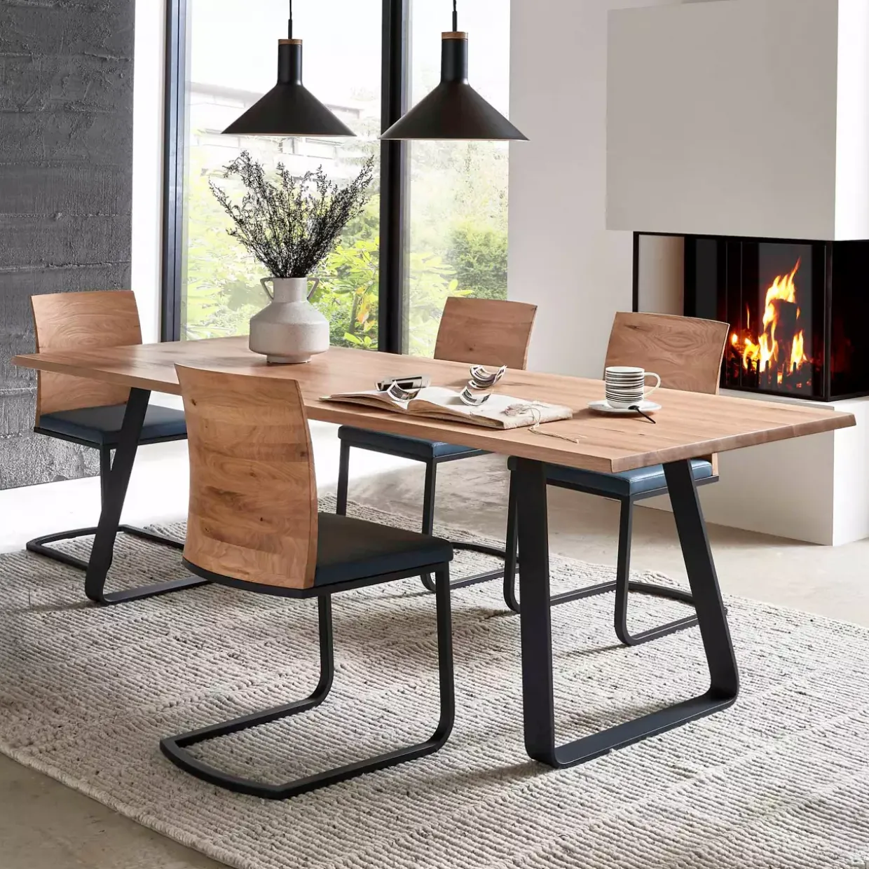 Die Oberfläche mit Hartwachsöl behandelt, präsentiert der Kufenesstisch aus Asteiche eine beeindruckende Kombination aus Funktionalität und Ästhetik. Der Tisch vereint die natürlichen Eigenschaften der Asteiche mit einer robusten Bauweise aus Holz und Metall. Die schrägkantige Tischplatte, deren Risse versiegelt sind, bietet eine perfekte Balance zwischen rustikalem Charme und moderner Eleganz.Ein besonderes Augenmerk verdient die Kufenform der Tischfüße, die nicht nur stabilen Halt gewährleistet, sondern auch einen markanten Akzent in der Raumgestaltung setzt. Die Farbgebung aus schwarzgrauem Metall und rustikaler Asteiche fügt sich harmonisch in verschiedene Einrichtungsstile ein, sei es ein traditionelles Ambiente oder ein zeitgemäßes Umfeld.Die geölte Oberfläche des Tisches sorgt für eine angenehme Haptik und hebt die natürliche Maserung des Holzes hervor, während sie gleichzeitig Schutz und Langlebigkeit bietet. Dieser Esstisch lädt zu geselligen Runden und gemütlichen Stunden ein und wird sicherlich zum Mittelpunkt Ihres Wohnbereichs. Ob bei einem gemütlichen Abendessen oder beim geselligen Beisammensein – diese Tischkreation steht für Qualität und zeitlose Eleganz. Lassen Sie sich von der Verbindung aus traditionellem Handwerk und modernem Design inspirieren.