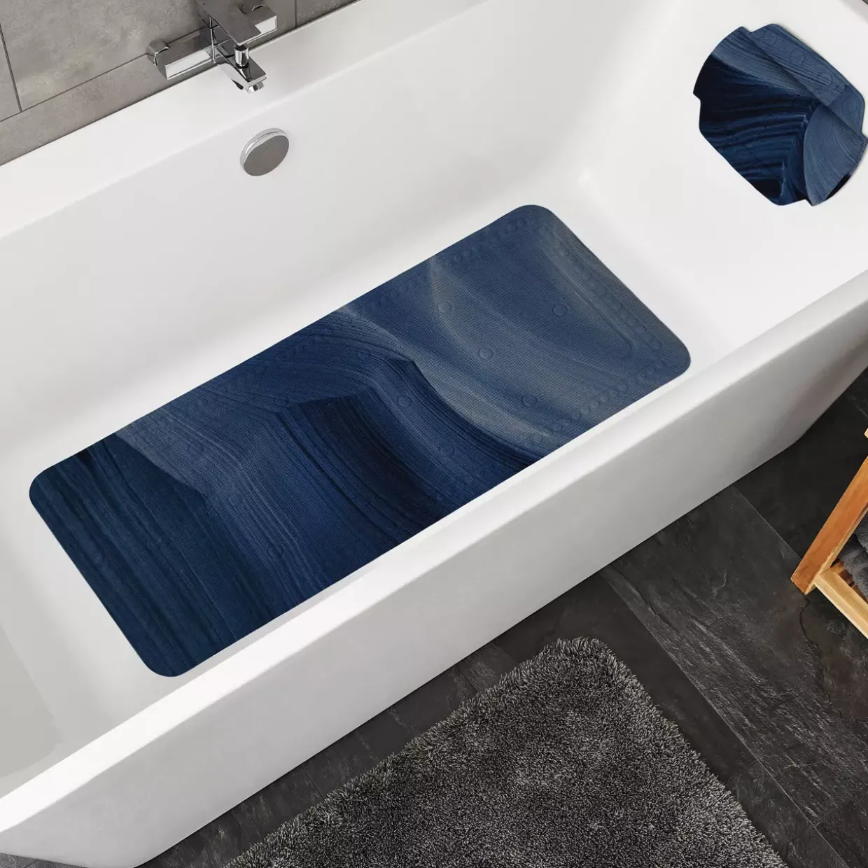 Tauchen Sie ein in modernen Stil mit dieser exquisiten Wanneneinlage in einem tiefen Navy-Ton. Aus hochwertigem Kunststoff gefertigt, bietet sie nicht nur eine elegante Optik, sondern auch eine langlebige und pflegeleichte Lösung für Ihr Badezimmer. Diese Wanneneinlage passt perfekt in jede moderne Badezimmereinrichtung und verleiht Ihrem Raum eine stilvolle Note.Die Pflegeleichtigkeit ist ein weiterer Vorteil dieses Produkts. Maschinenwaschbar bei bis zu 40°C im Schonwaschgang, lässt sich die Wanneneinlage mühelos reinigen. Ohne bleichen, bügeln oder trocknen im Trockner bleibt sie in ihrer ursprünglichen Form und Farbe erhalten. Das Material ist dafür bekannt, seine Qualität auch nach mehreren Waschgängen zu bewahren.Der Kunststoff sorgt für eine rutschfeste Oberfläche, die Sicherheit und Komfort gleichermaßen bietet. Der elegante Navy-Farbton harmoniert wunderbar mit verschiedenen Badezimmerdekoren und bringt einen Hauch von Eleganz in Ihr Zuhause. Genießen Sie die Kombination aus Funktionalität und Ästhetik, die diese Wanneneinlage bietet. Eine ideale Wahl für alle, die Wert auf modernes Design und einfache Pflege legen. Entdecken Sie die perfekte Ergänzung für Ihr Badezimmer, die sowohl praktisch als auch stilvoll ist.