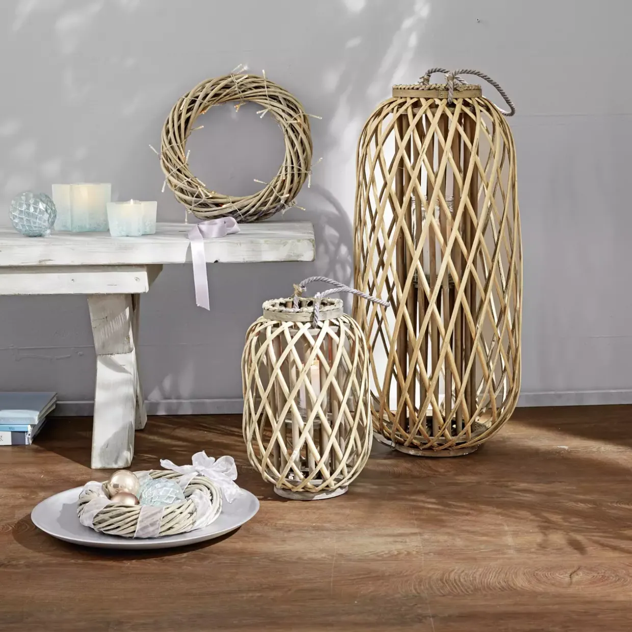 In einem modernen Stil präsentiert sich die naturfarbene Laterne als ein elegantes Dekorationsobjekt für Ihr Zuhause. Hergestellt aus einer harmonischen Kombination von Glas, Holz und Kunststoff, vereint sie Funktionalität und Ästhetik auf gelungene Weise. Die Verwendung von Weidenholz verleiht der Laterne eine natürliche und warme Ausstrahlung, die sich perfekt in verschiedene Einrichtungsstile einfügt.